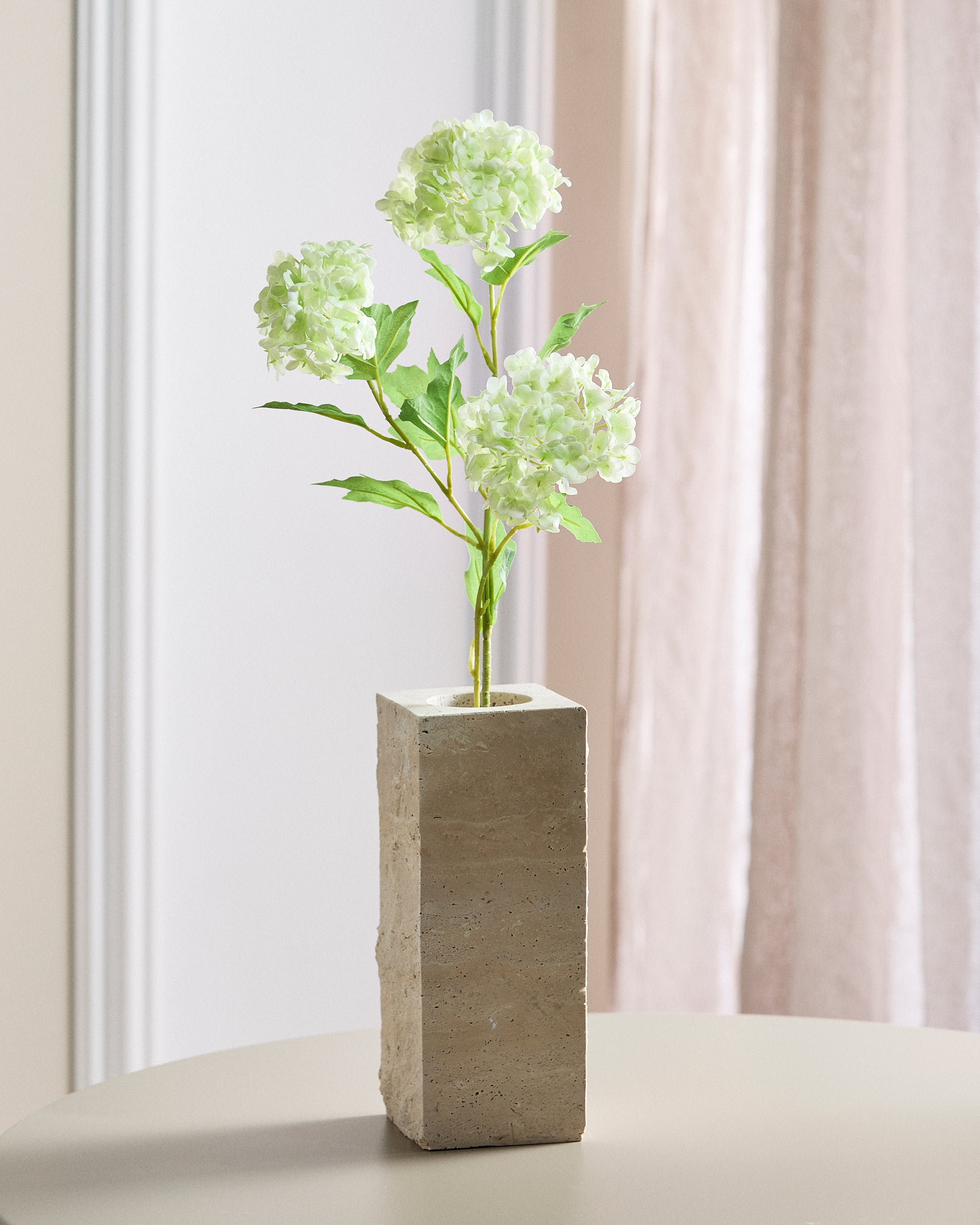 Denne kunstige hortensia er omhyggeligt designet med tre fyldige, hvide blomster og fine detaljer, der efterligner den ægte plantes klassiske skønhed. Perfekt til at skabe et sofistikeret og frisk udtryk i dit hjem eller på kontoret.
