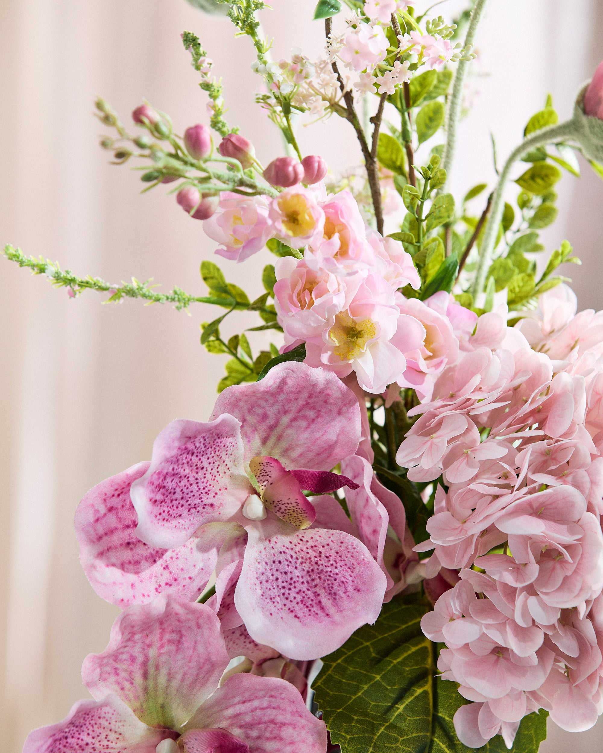 Pink Obsession er en drømmende og moderne buket i nuancer af blush, rose og hindbær. En fyldig midte giver blød volumen, mens elegante orkidéblomster, lette spir og friske grønne detaljer tilfører højde, bevægelse og finesse. Resultatet er et feminint stateme nt – romantisk og luksuriøs. Skabt til dig, der ønsker øjeblikkelig varme og stilfuld ro i dit hjem.