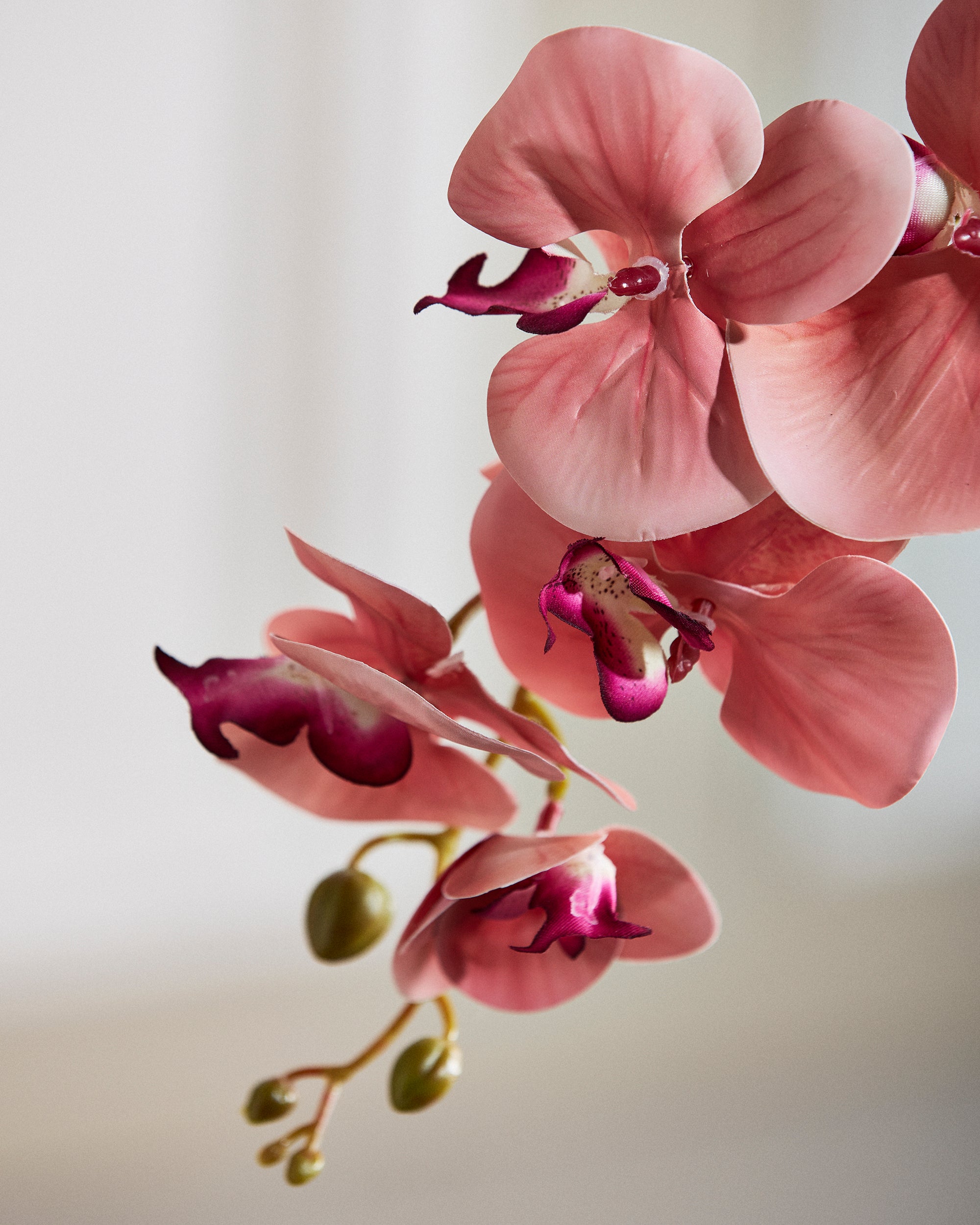 Den 9-hovede kunstige sommerfugleorkidé er en omhyggeligt fremstillet kunstig blomst, der indfanger elegancen fra ægte orkideer. Med en højde på 96 cm har den ni latexbelagte blomster på stilk, som er forstærket med en jerntrådskerne. Dette gør det nemt at trimme og fleksibelt at placere, så den passer til dine dekorative behov.