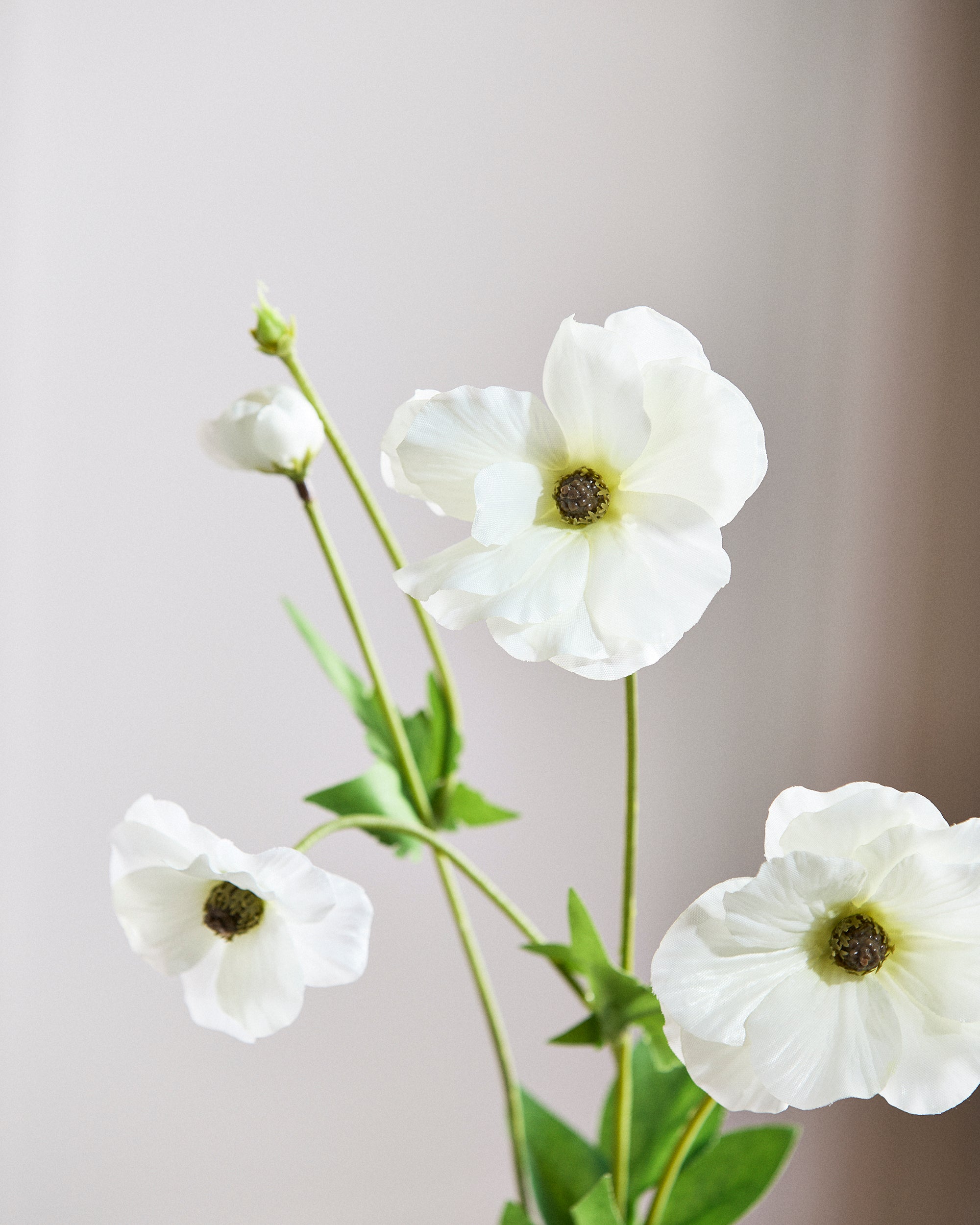 Denne fine sommerfugle-ranunkelblomst fremstår slank og yndefuld med et let udtryk. Stilken består af fem blomster: to fuldt udsprungne, én delvist åben, én næsten udsprunget og én knop. Blomsterne er lavet af silke for at give dem deres yndefulde udseende.