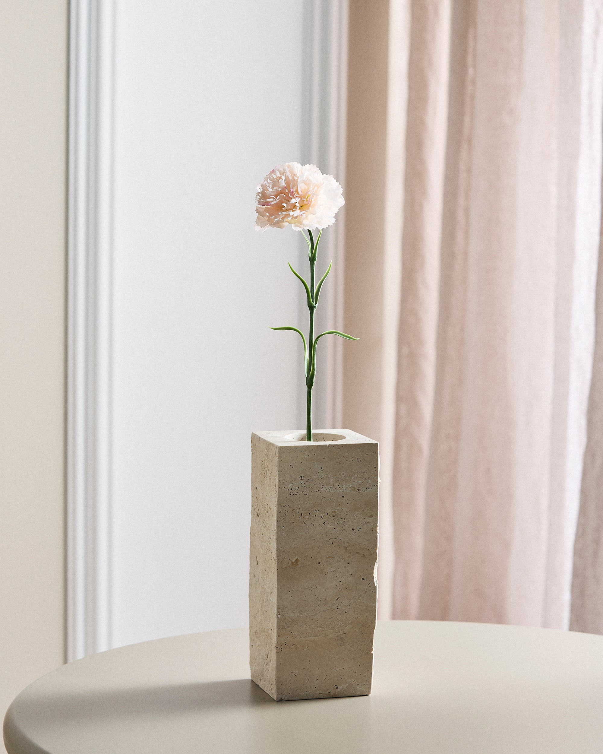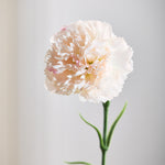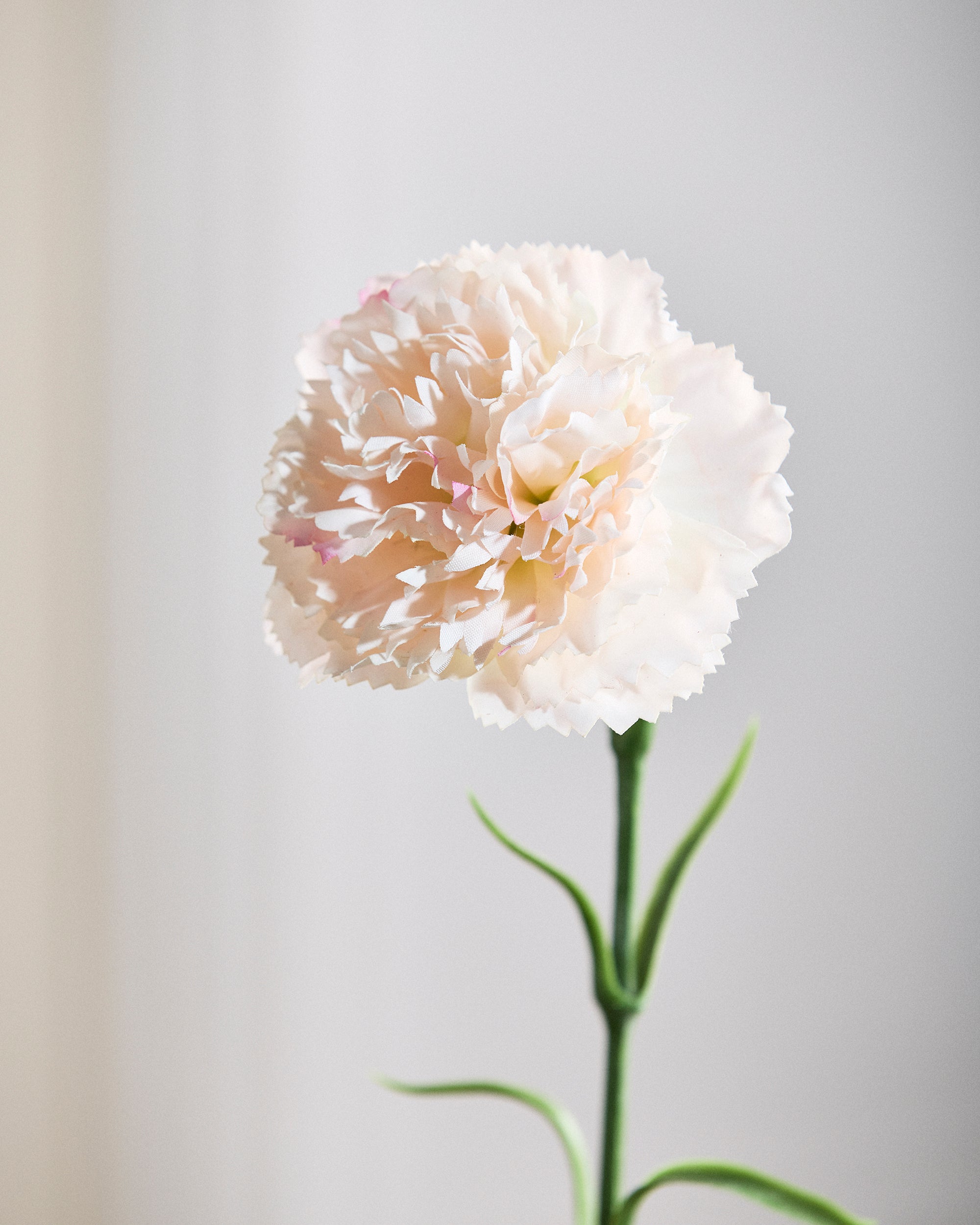 Hver nellike er håndlavet i silke med en blød latexbelægning, som tilfører kronbladene en livagtig struktur og følelse. De bølgede, lagdelte kronblade i en afdæmpet champagnefarve skaber et fyldigt og realistisk udtryk, der passer smukt i både klassiske og moderne dekorationer.