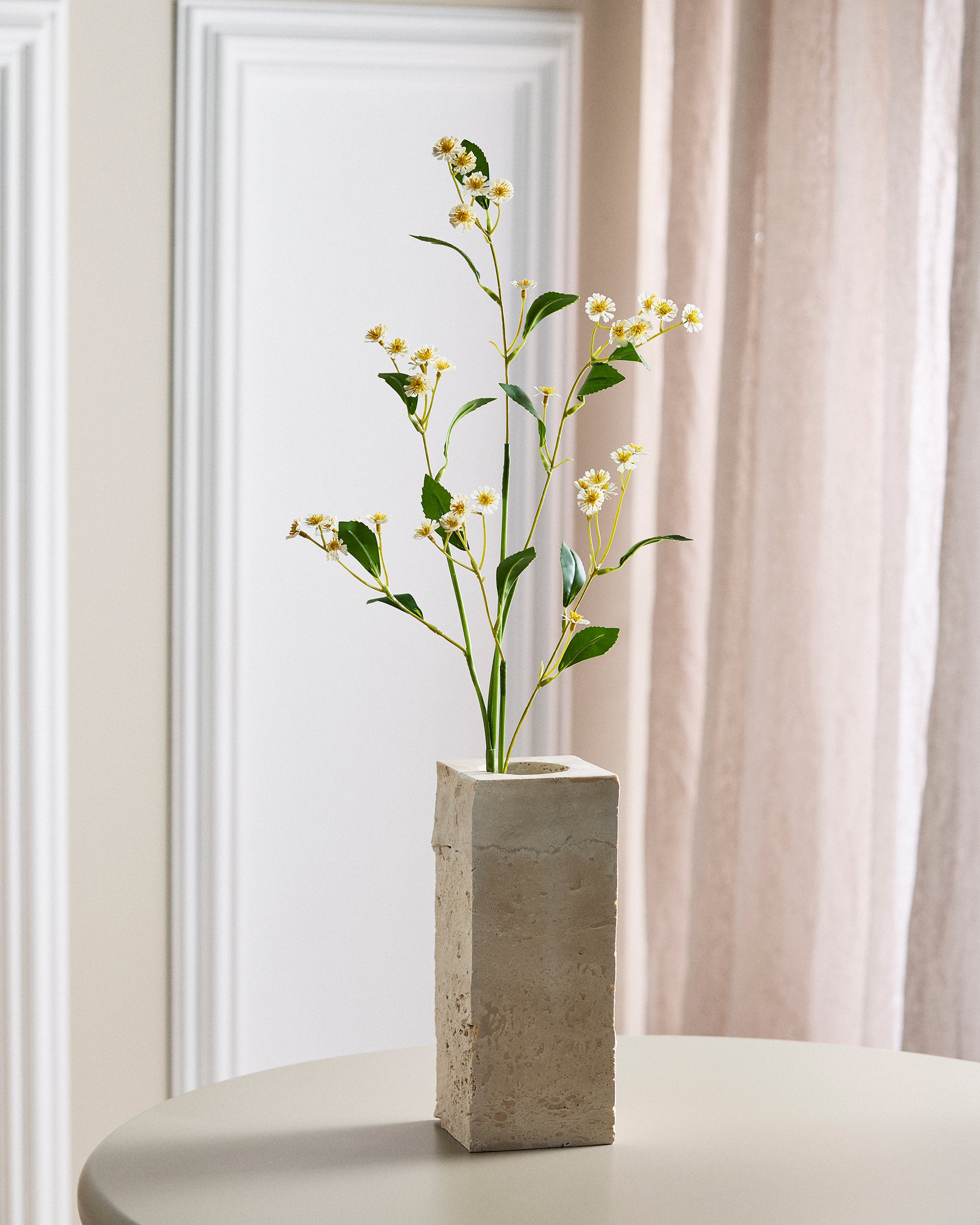 Vores Kamille Marguerit i Hvid er en høj og yndefuld stilk, med mange fine små åbne blomsterhoveder med hvide silkeblade og bløde gule midter - stilken og bladene er udført i plastik for et realistisk udseende.