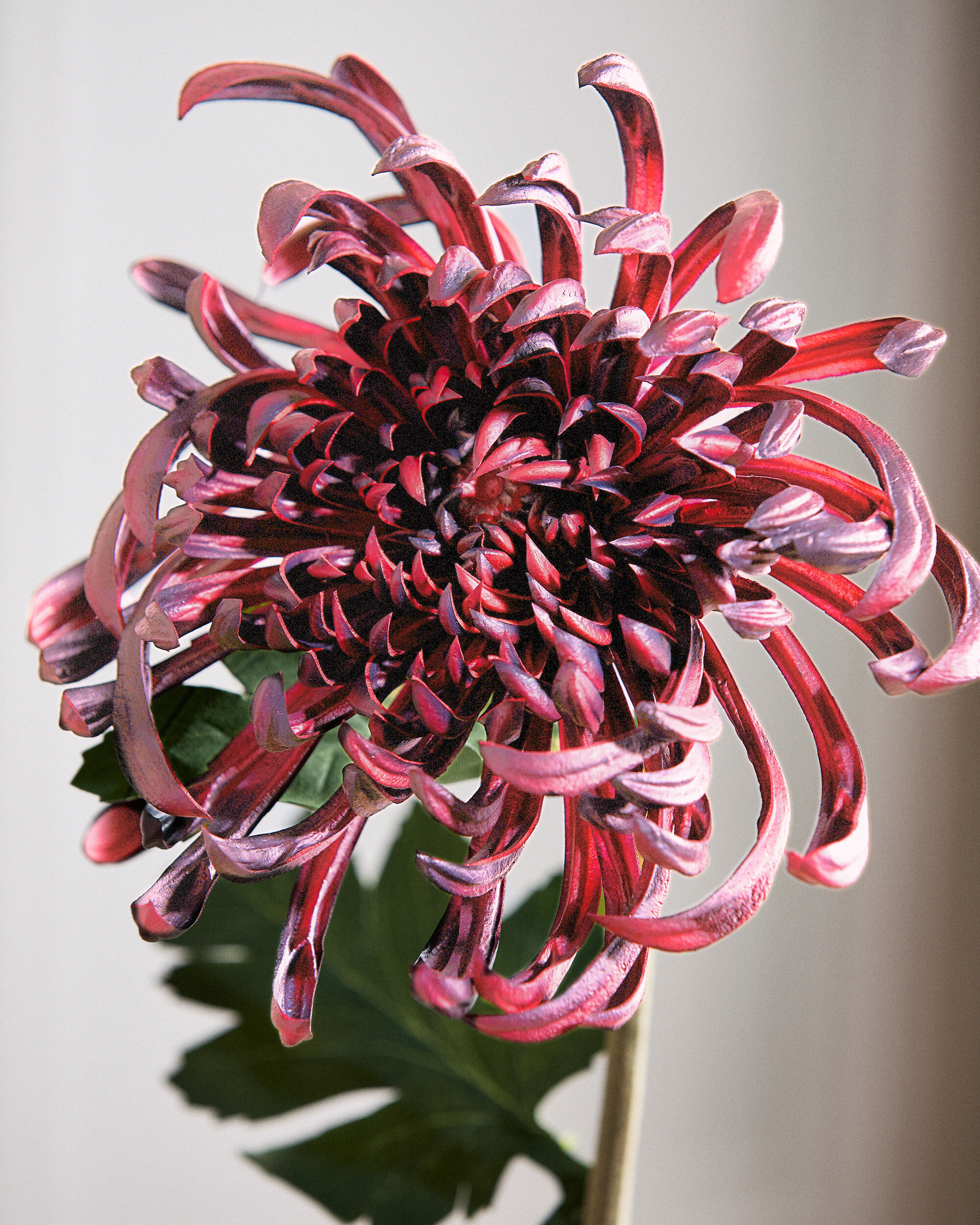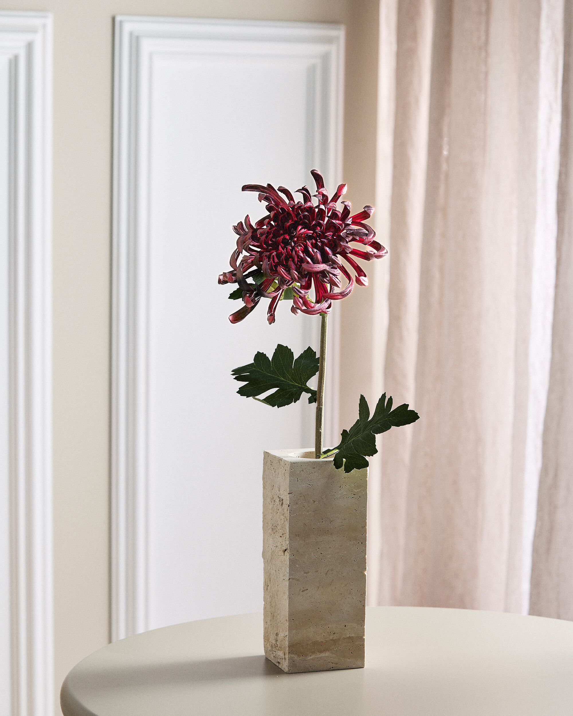 Krysantemum i bordeaux er oplagt som fokuspunkt i en buket, men kan også nemt kombineres med andre stilke for at skabe personlige og unikke arrangementer. Den tilfører elegance, varme og dybde til ethvert rum og udstråler tidløs raffinement – år efter år, uden at kræve vanding eller pleje.