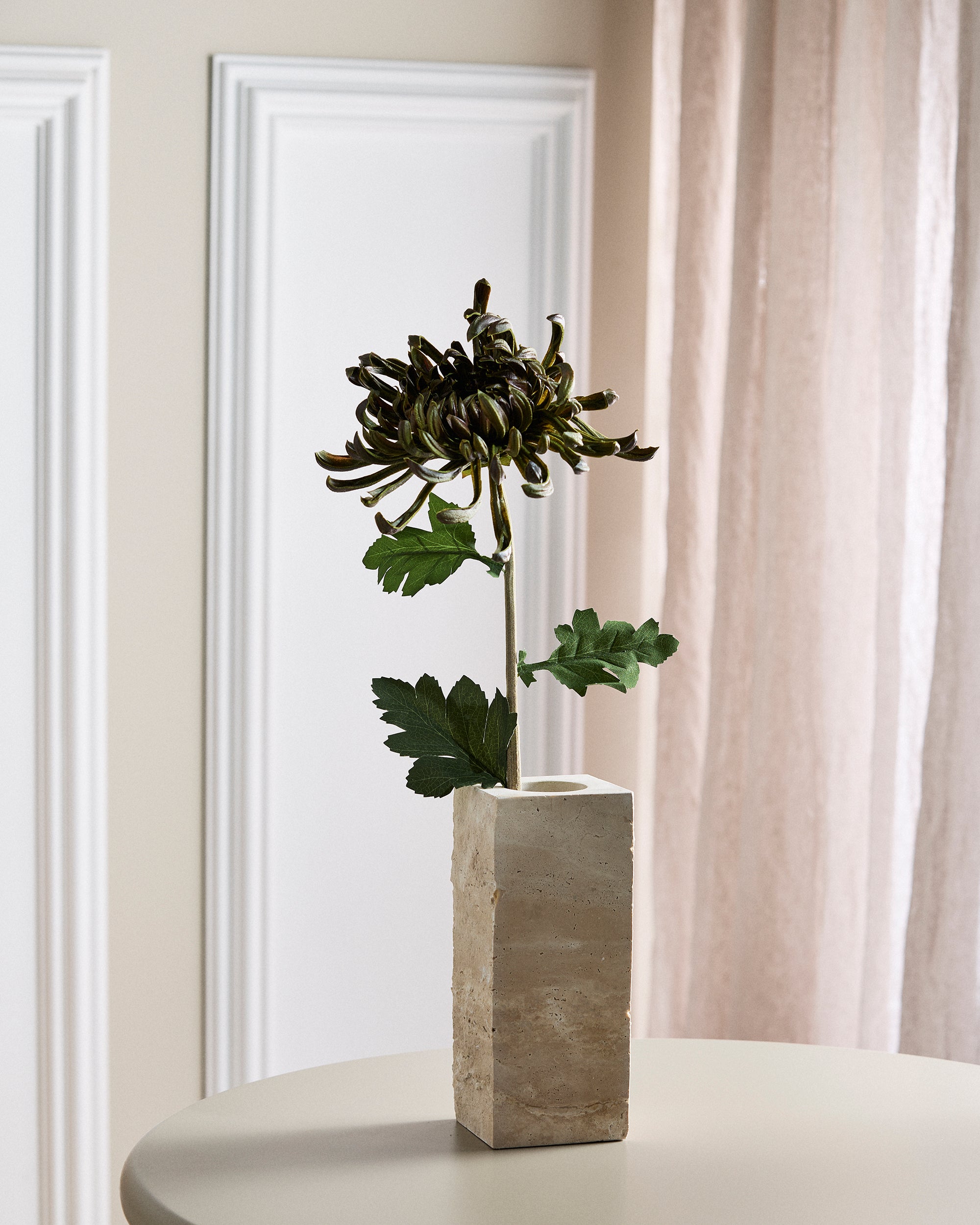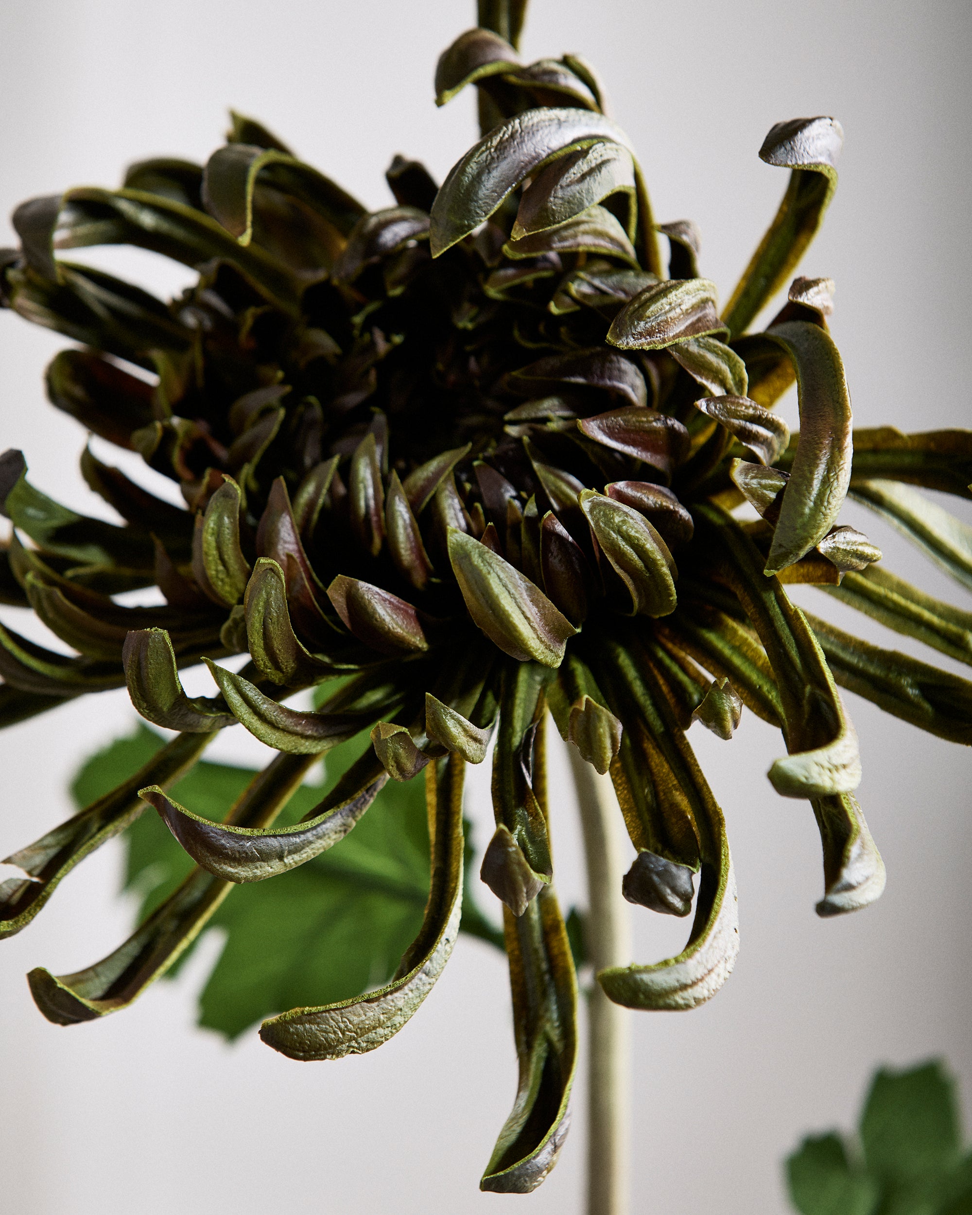 Krysantemum i grøn er oplagt som fokuspunkt i en buket, men kan også nemt kombineres med andre stilke for at skabe personlige og unikke arrangementer. Den tilfører elegance, varme og dybde til ethvert rum og udstråler tidløs raffinement – år efter år, uden at kræve vanding eller pleje.