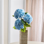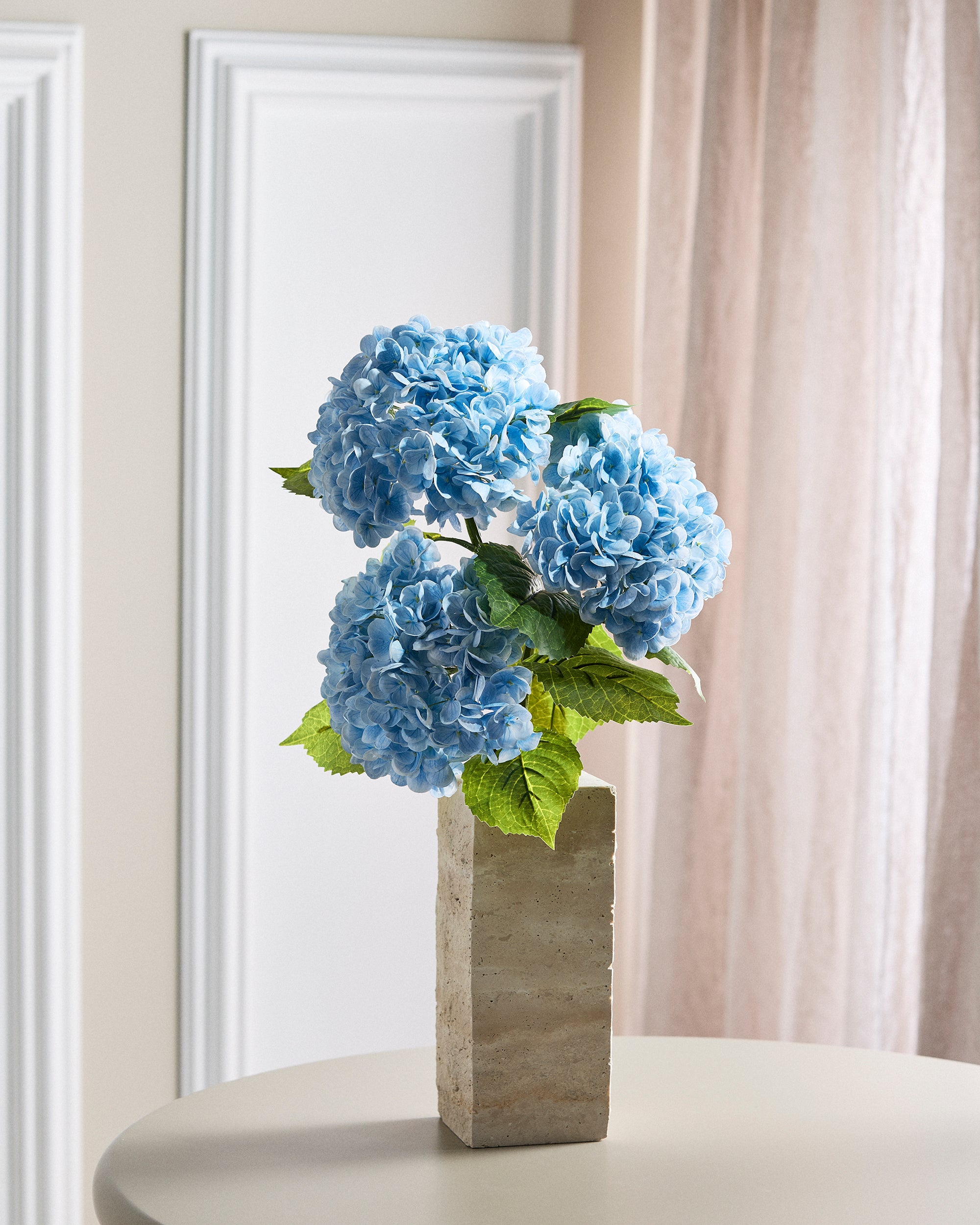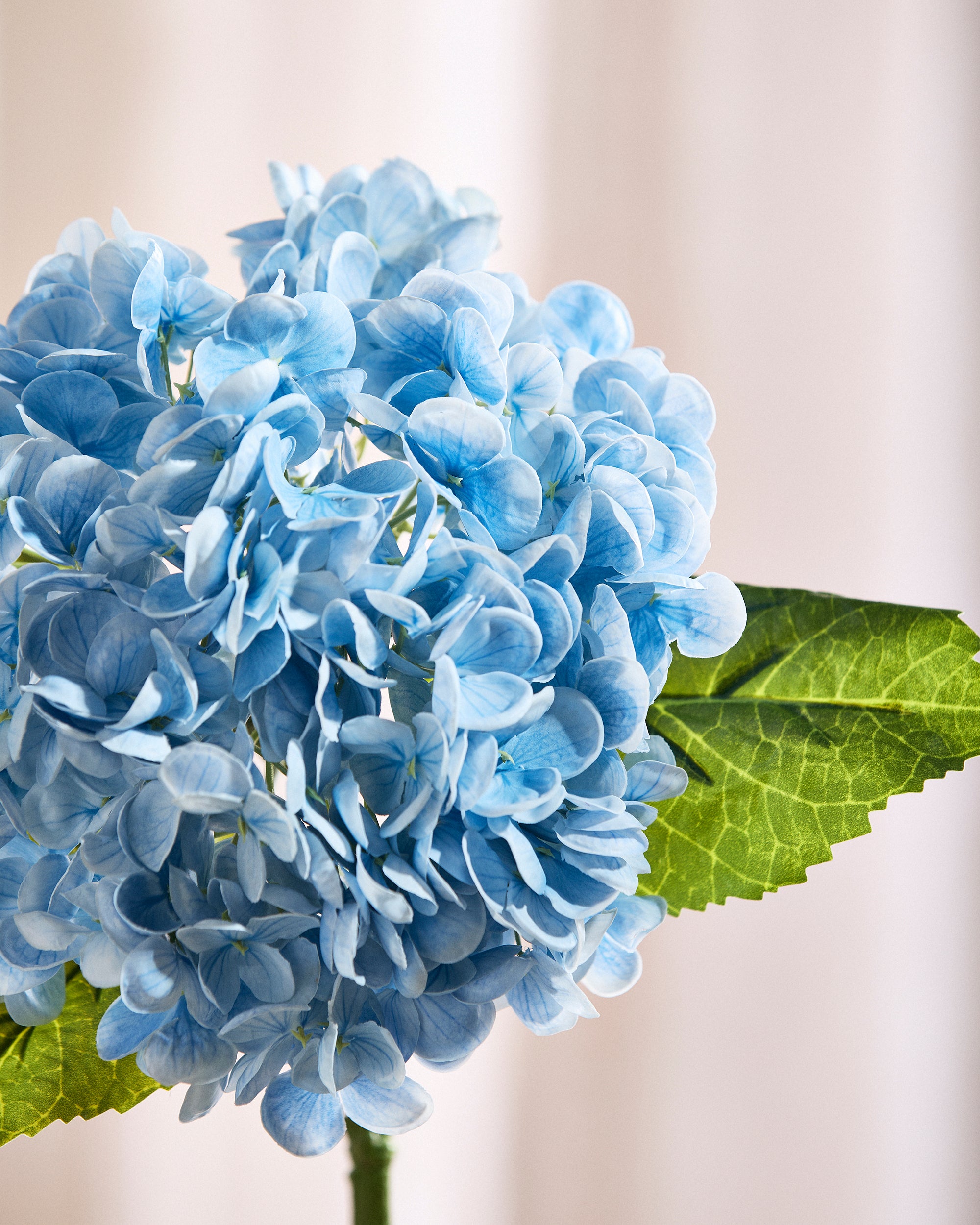 Vores pragtfulde buket består af tre naturtro hortensiaer, der imponerer med deres autentiske teksturer og livlige blade. Disse blomster tilføjer en taktil dimension med deres livagtige struktur og udstråler tidløs charme.