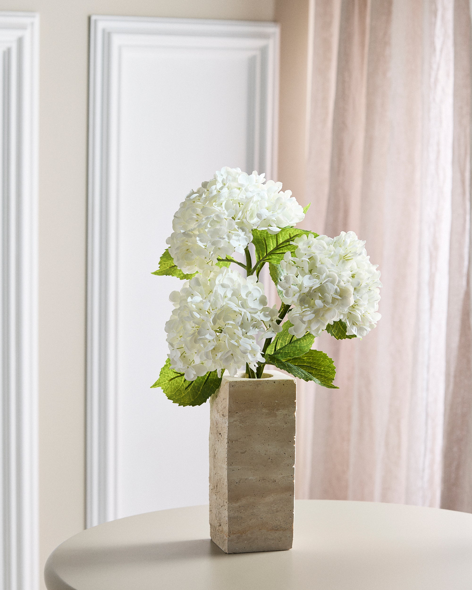 Vores pragtfulde buket består af tre naturtro hortensiaer, der imponerer med deres autentiske teksturer og livlige blade. Disse blomster tilføjer en taktil dimension med deres livagtige struktur og udstråler tidløs charme.