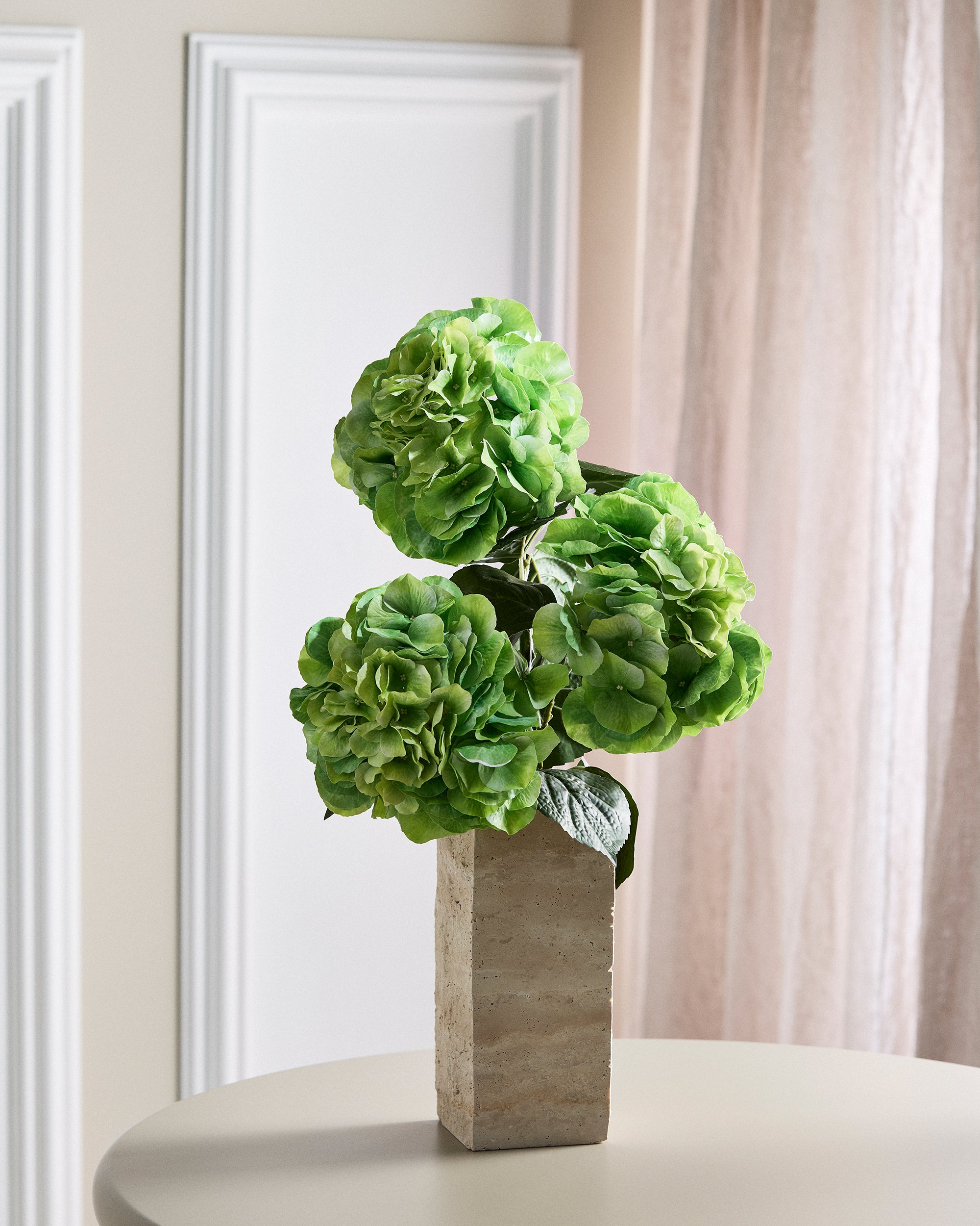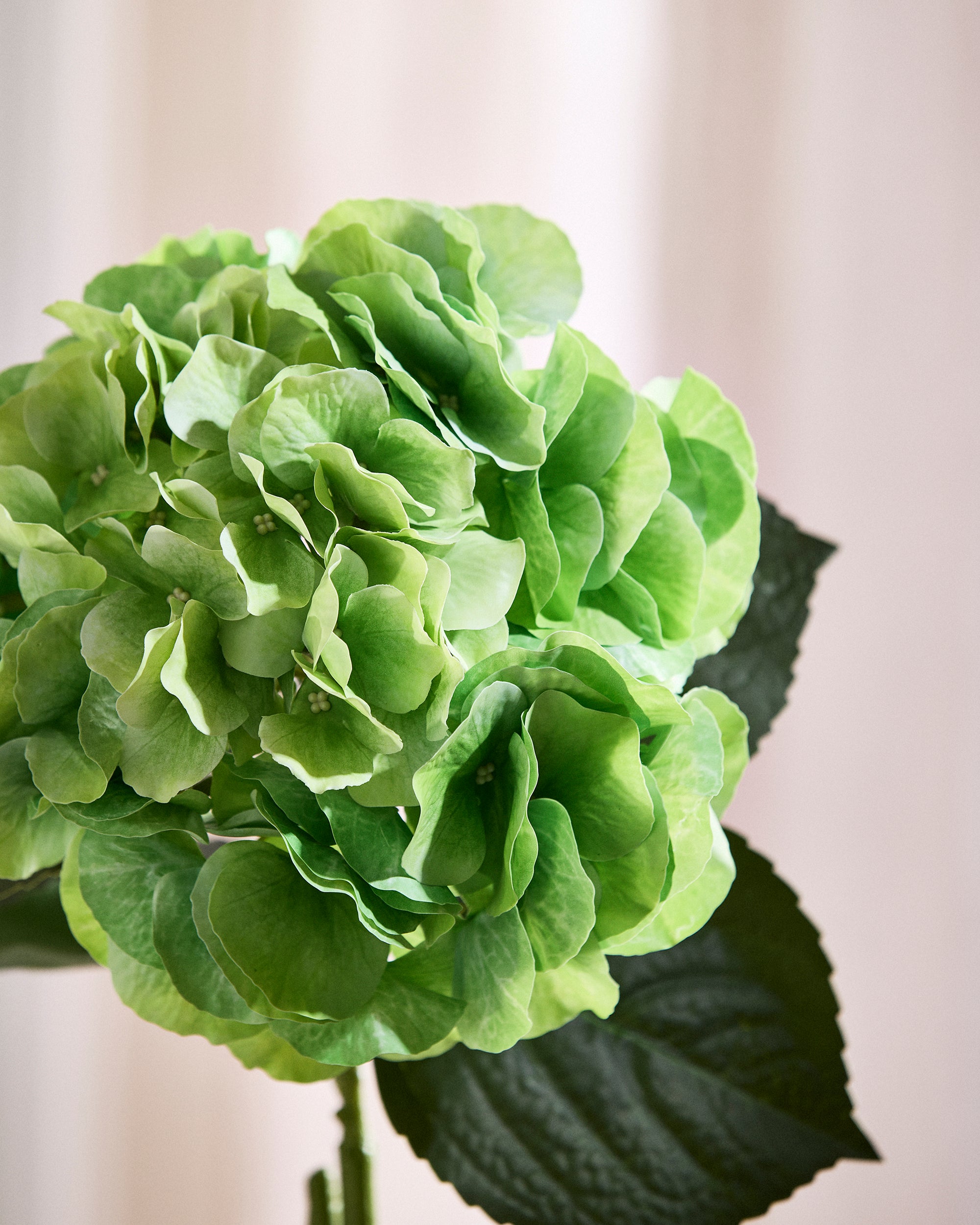 Vores pragtfulde buket består af tre naturtro hortensiaer, der imponerer med deres autentiske teksturer og livlige blade. Disse blomster tilføjer en taktil dimension med deres livagtige struktur og udstråler tidløs charme.