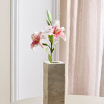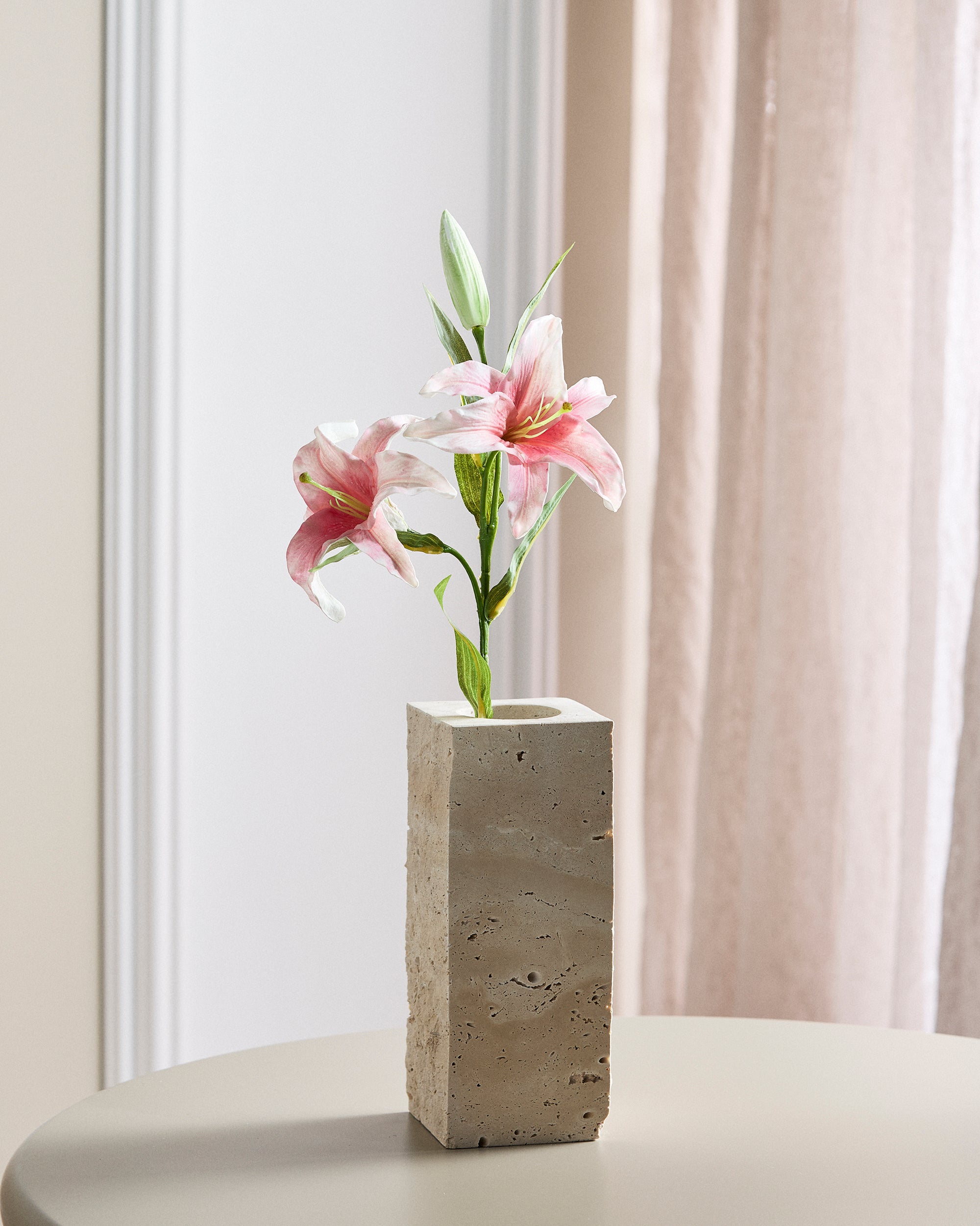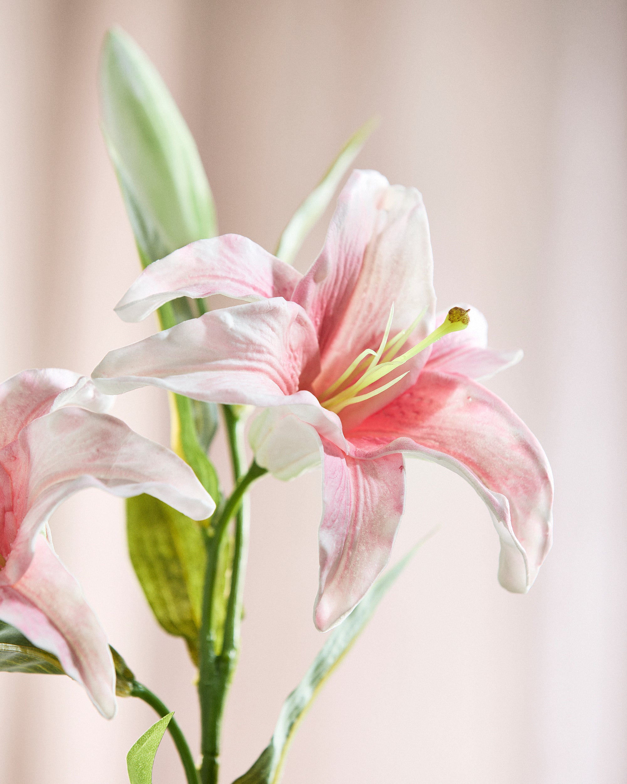 Vores tre-hovedet Lilje Blomst har to fuldt udsprungne blomster og én, der stadig venter på at folde sig ud, hvilket skaber en utrolig livagtig og dynamisk opsætning.