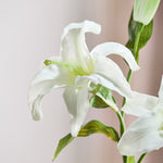 Vores tre-hovedet Lilje Blomst har to fuldt udsprungne blomster og én, der stadig venter på at folde sig ud, hvilket skaber en utrolig livagtig og dynamisk opsætning.