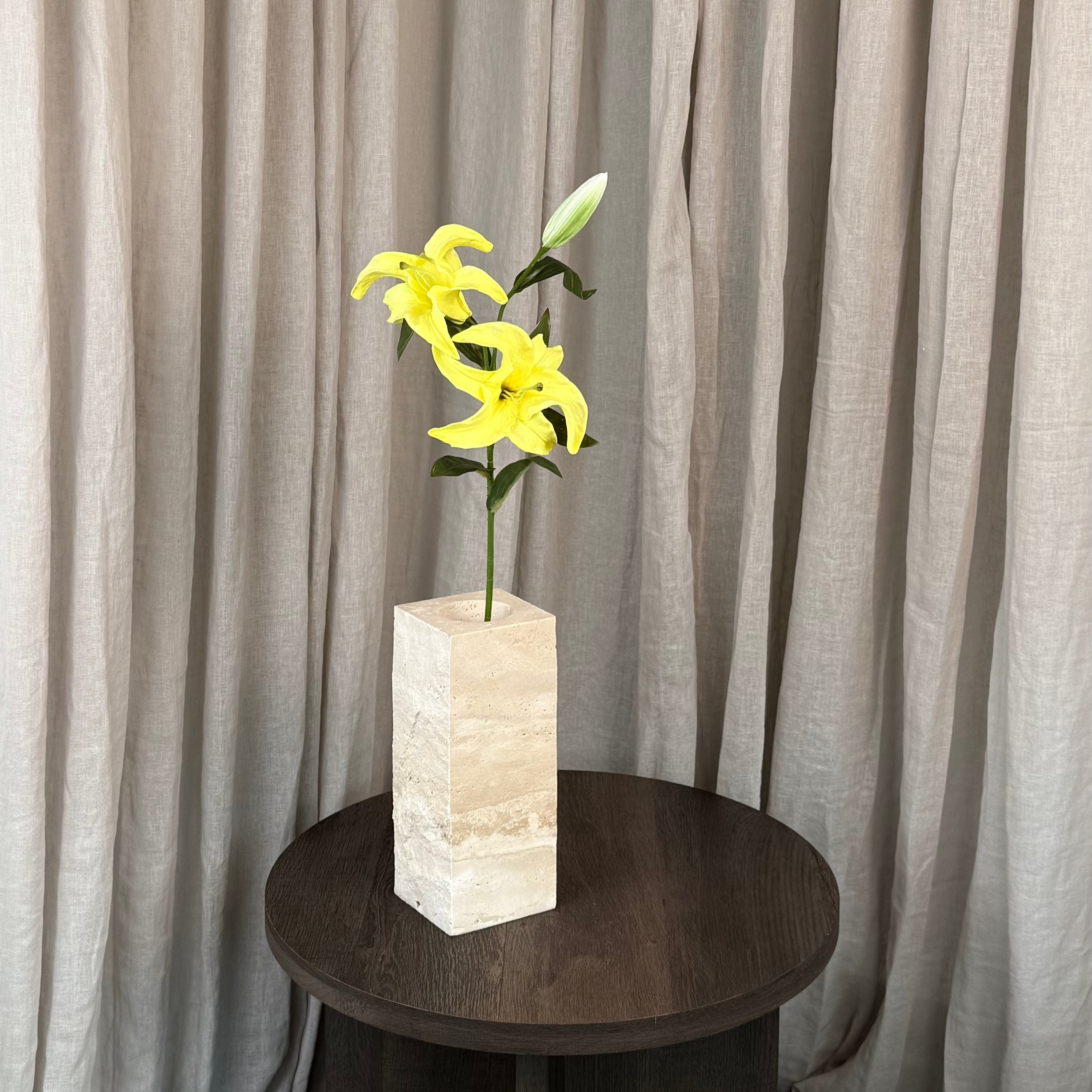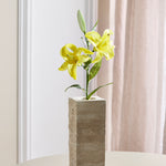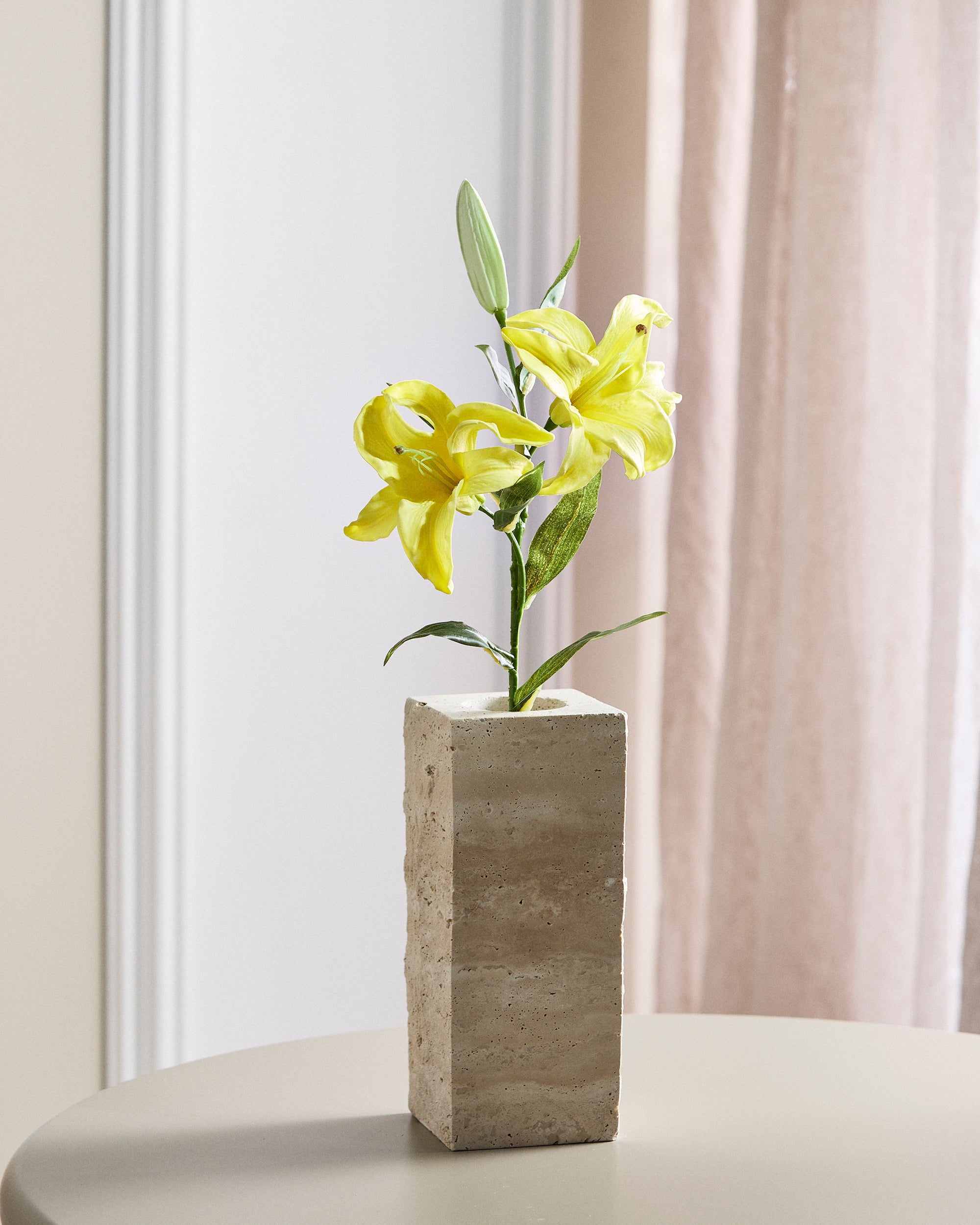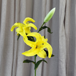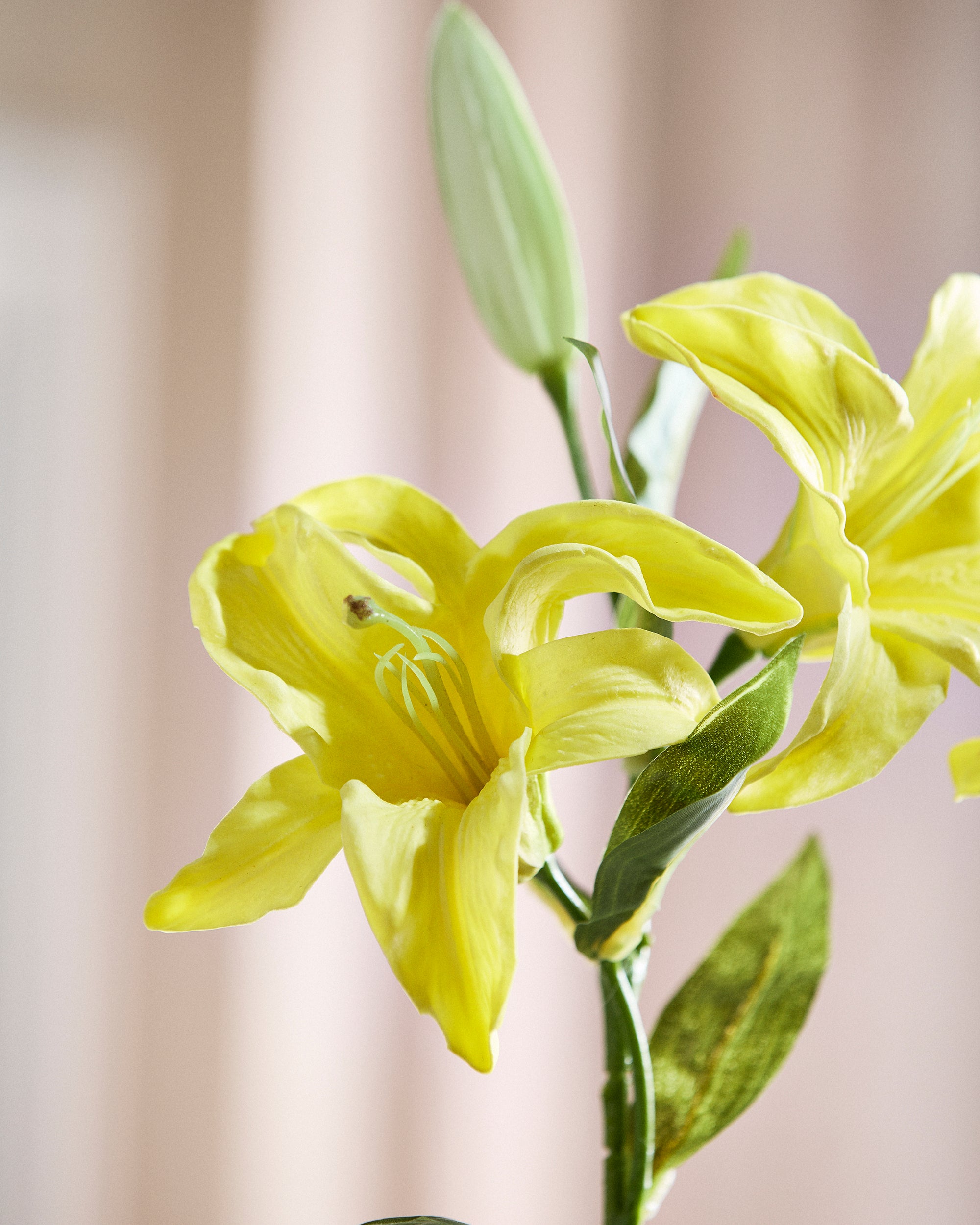 Vores tre-hovedet Lilje Blomst har to fuldt udsprungne blomster og én, der stadig venter på at folde sig ud, hvilket skaber en utrolig livagtig og dynamisk opsætning.
