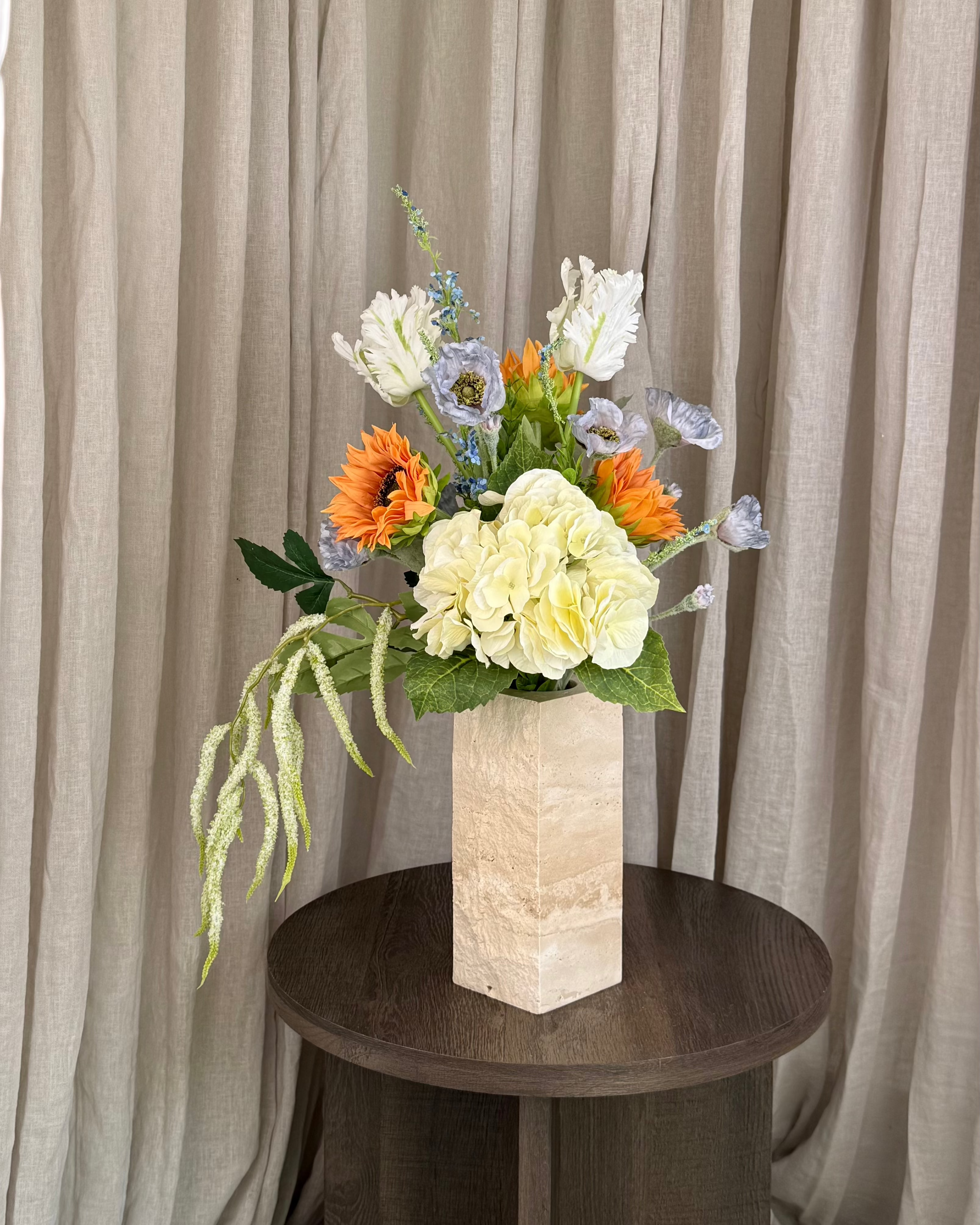 Lost in Tokyo er en farverig buket med attitude. Sart blå, beige og brændt orange skaber et levende og stilrent udtryk – med masser af personlighed og varme. Papegøjetulipanerne i samspil med solsikkerne bringer en storbyvibe med sig – sofistikeret, selvsikker og langt fra det nordiske udtryk.
