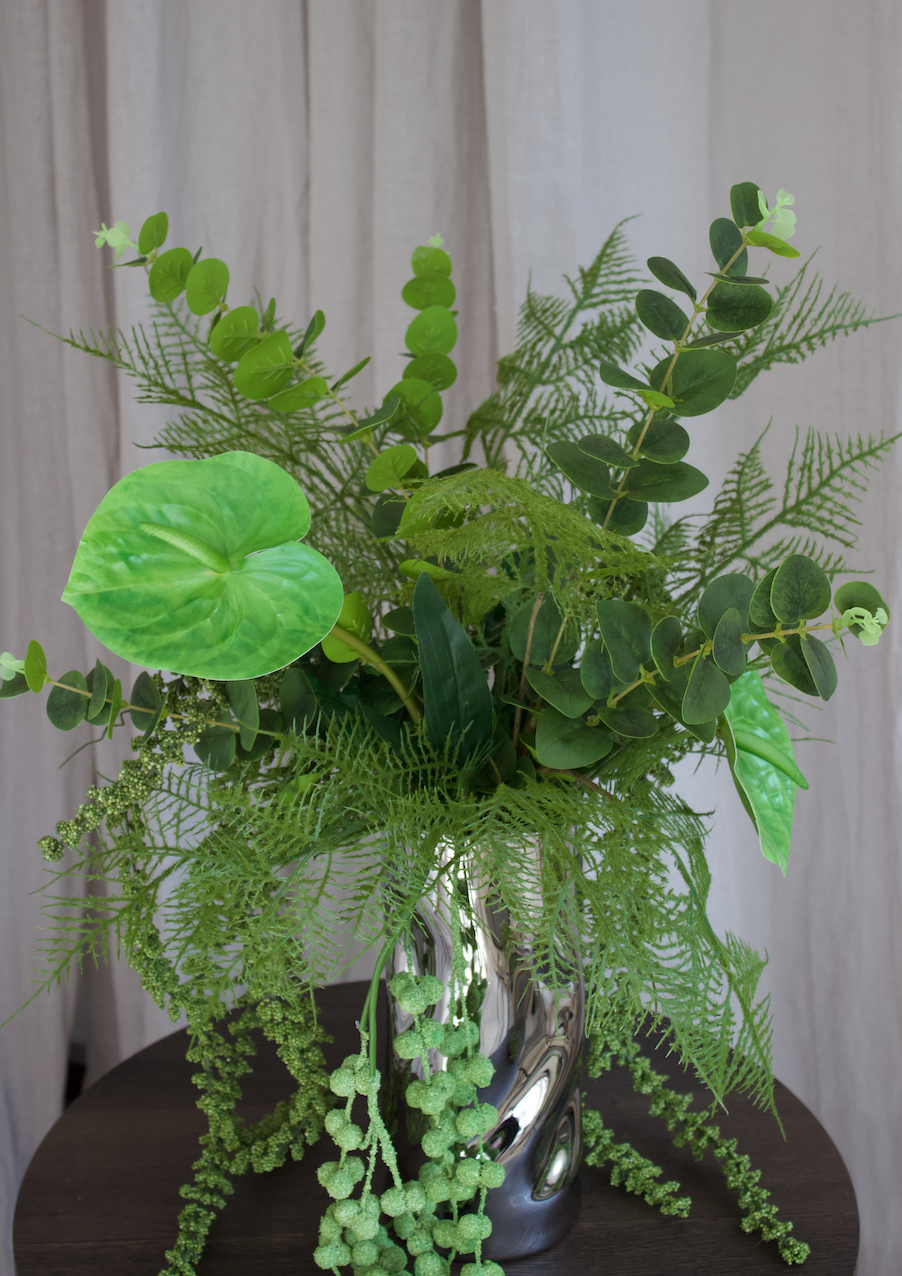 Hidden Forest er en frodig og skulpturel buket i dybe skovgrønne nuancer. Lag af bregner, eukalyptus og blanke, tropiske blade skaber ro, dybde og bevægelse, mens de lange, hængende ranker falder blødt over vasens kant—som en lille hemmelig skov i dit hjem. Perfekt til dig, der ønsker et rent, grønt statement med naturlig elegance og sans for detaljer.