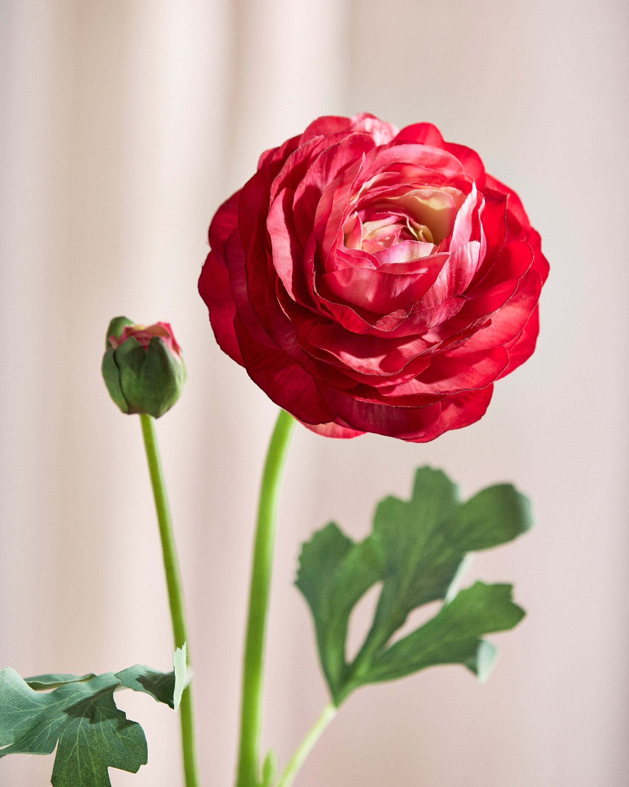 Blomsten er udført i luksus real touch-kvalitet af ultrafin tekstil, så den både ser naturtro ud og føles næsten som en ægte ranunkel.