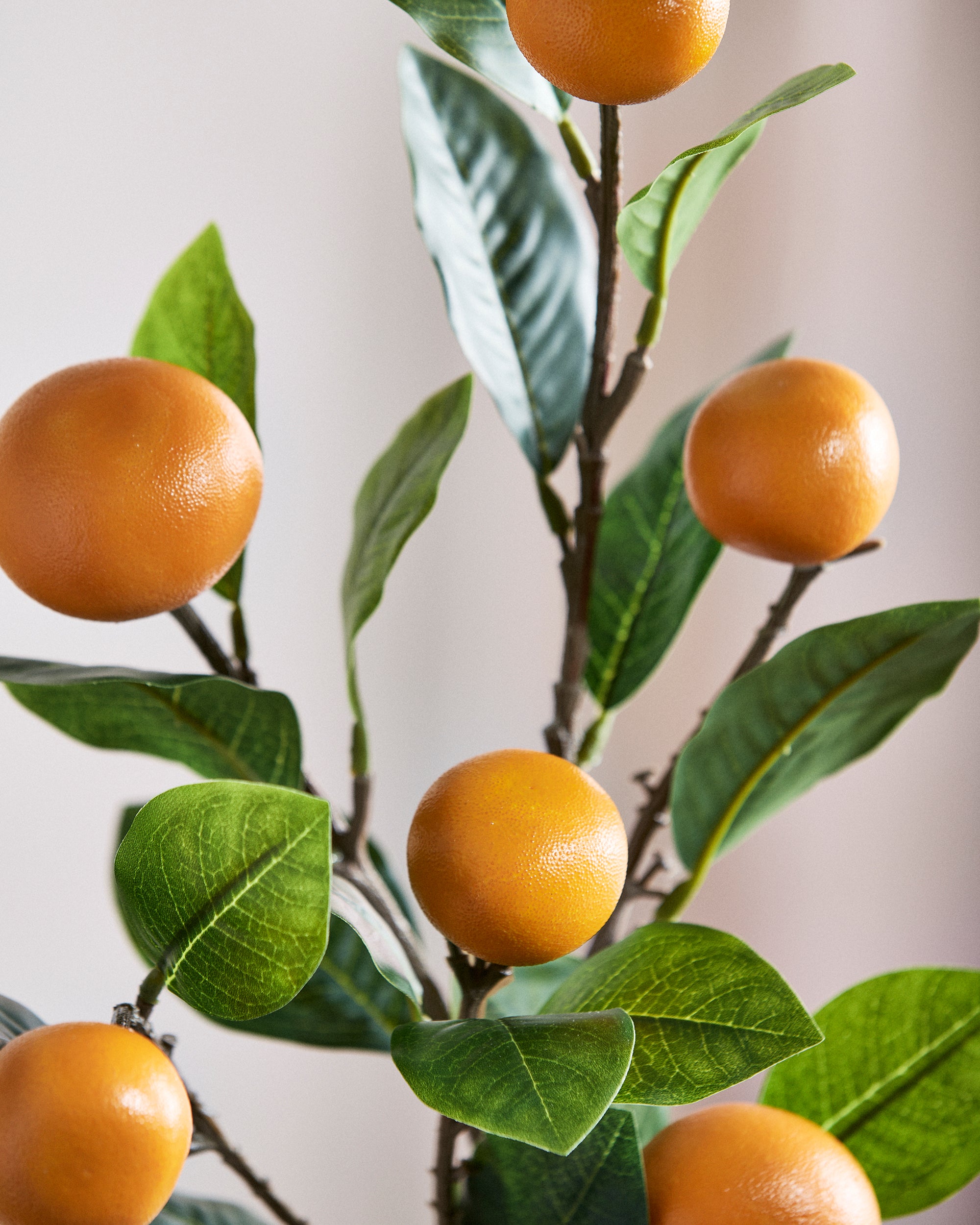 Hver gren er håndlavet med naturtro mandariner i blødt skum, der gengiver frugtens fine struktur og farvespil perfekt. De fyldige frugter og grønne blade har subtile variationer i nuancer og form, som sikrer en imponerende realisme.