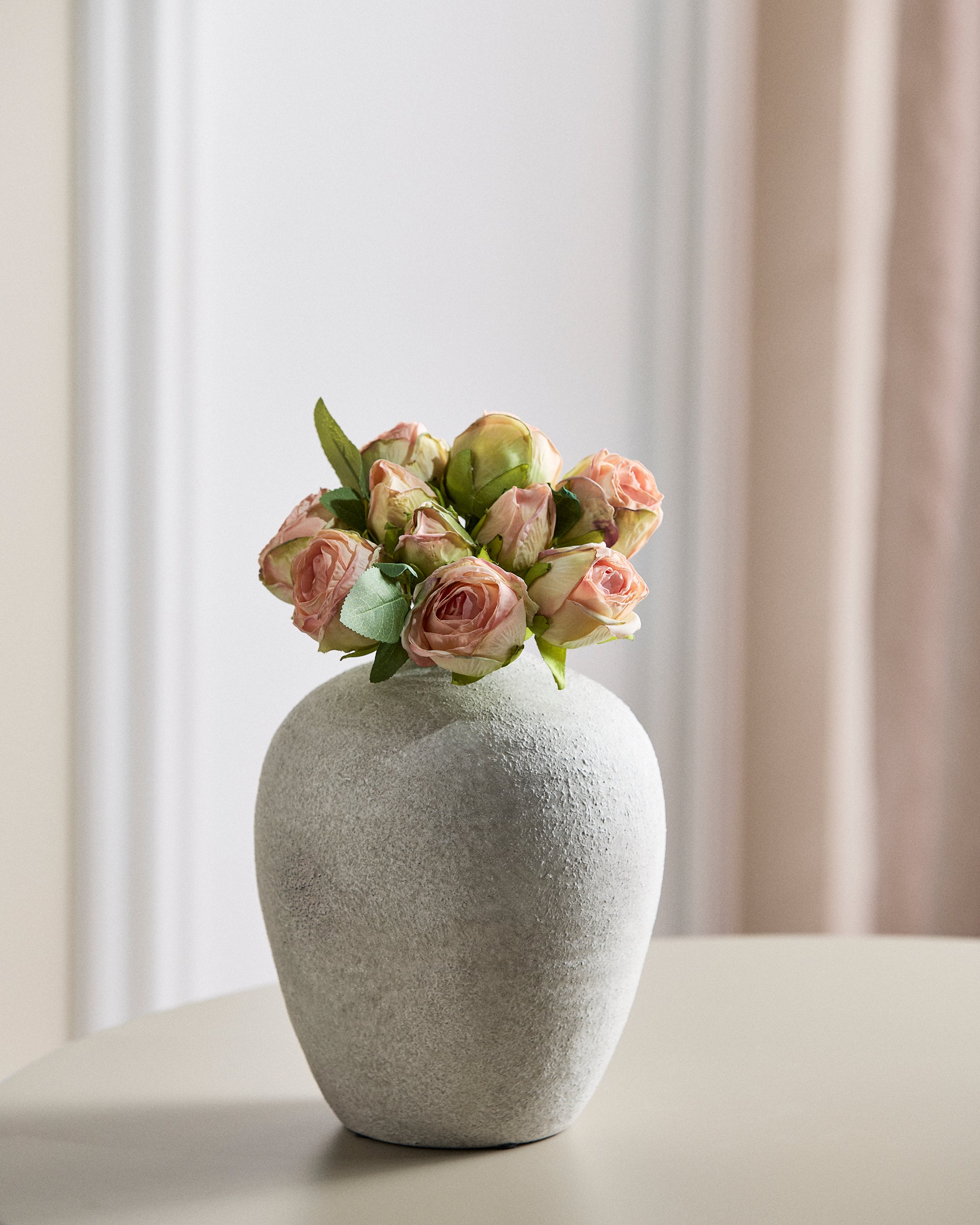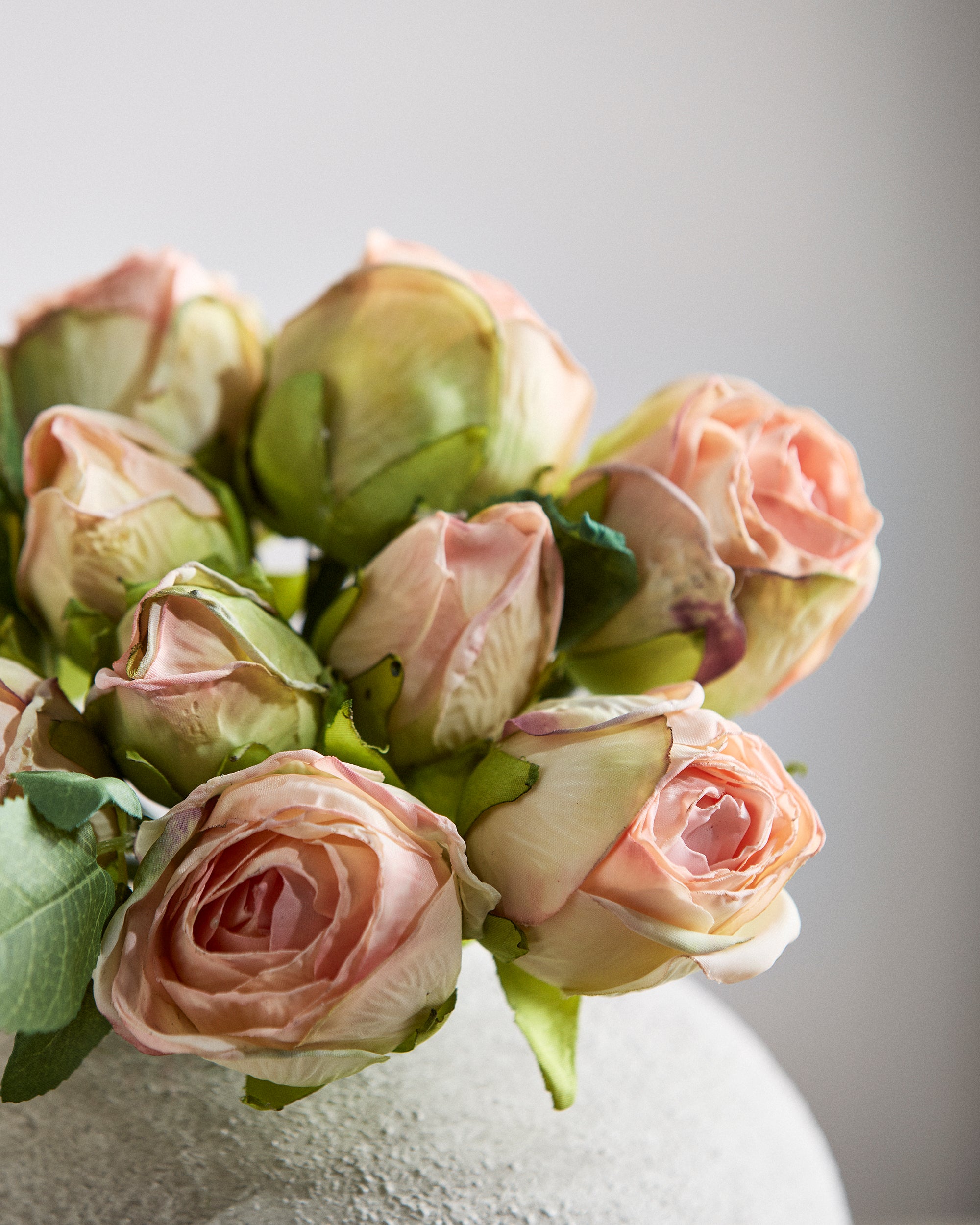 Nænsomt udformet, denne buket indeholder bløde og elegante mini-roser, der bringer et klassisk og romantisk præg til ethvert rum. Perfekt til små arrangementer eller som et supplement i en større buket.