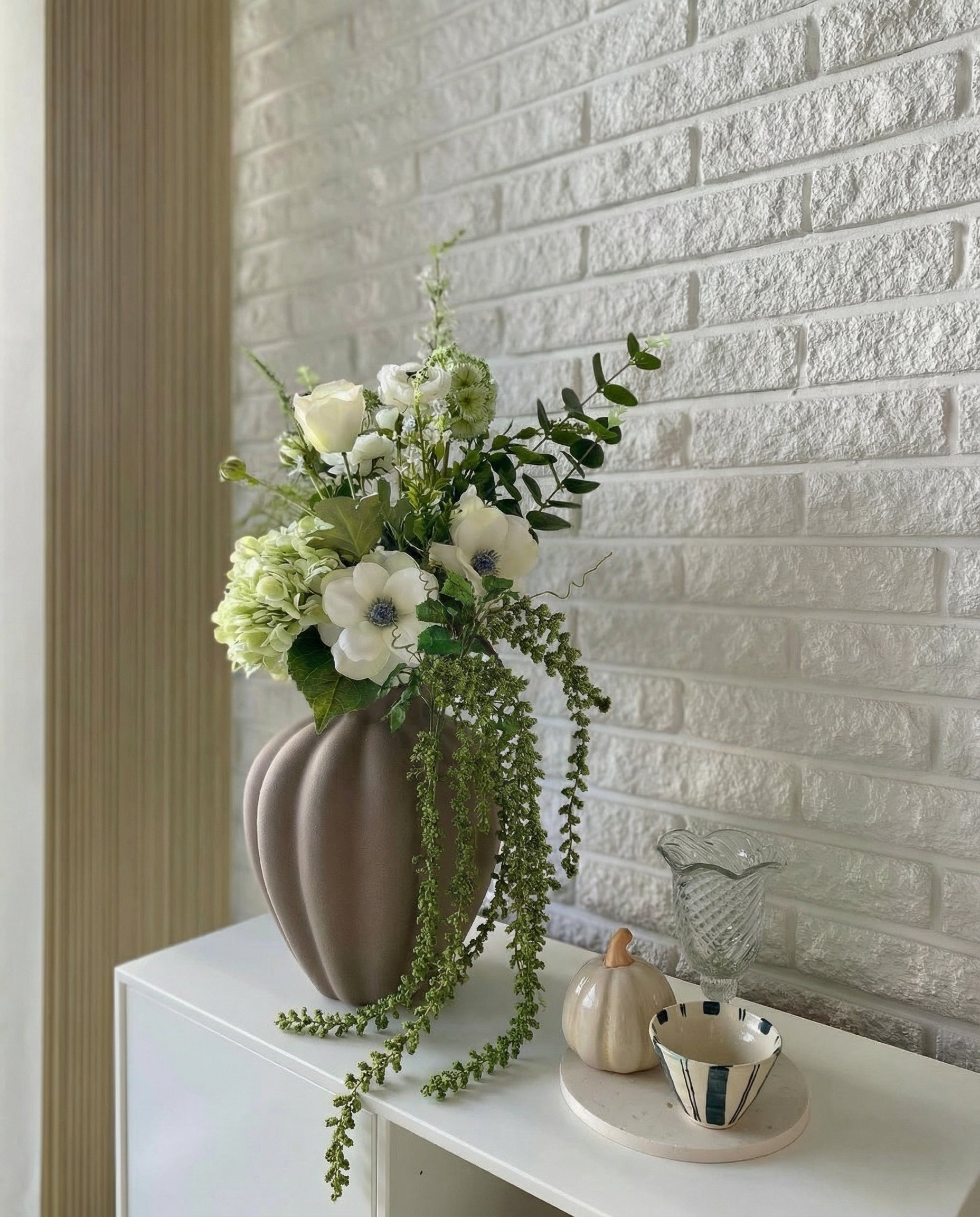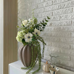 En blid og frisk sammensætning i lysegrønne og hvide nuancer. Minty Mix emmer af lethed – som en tidlig sommermorgen, hvor lyset falder blødt, og alt føles stille og nyt. De rene linjer brydes af den viltre amaranthus, som giver buketten et levende, drømmende udtryk.