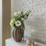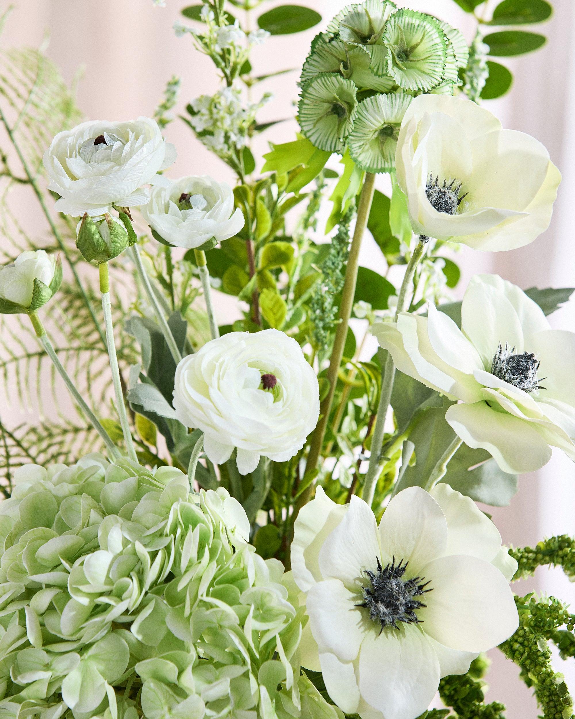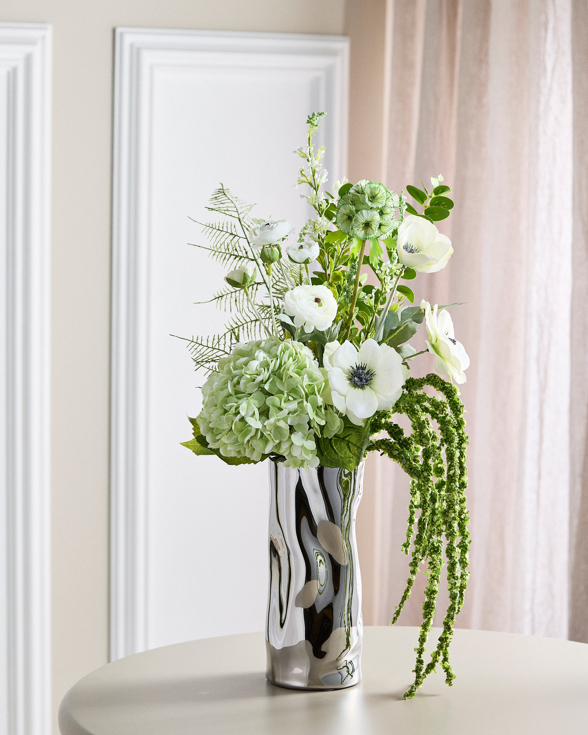 En blid og frisk sammensætning i lysegrønne og hvide nuancer. Minty Mix emmer af lethed – som en tidlig sommermorgen, hvor lyset falder blødt, og alt føles stille og nyt. De rene linjer brydes af den viltre amaranthus, som giver buketten et levende, drømmende udtryk.