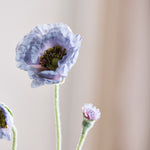 Karakterfuld valmue med store, krøllede kronblade, mørk midte og naturligt svaj i stilken. Den adskiller sig fra vores klassiske valmue ved at være større i blomsterhovedet og mere markant i udtrykket.