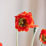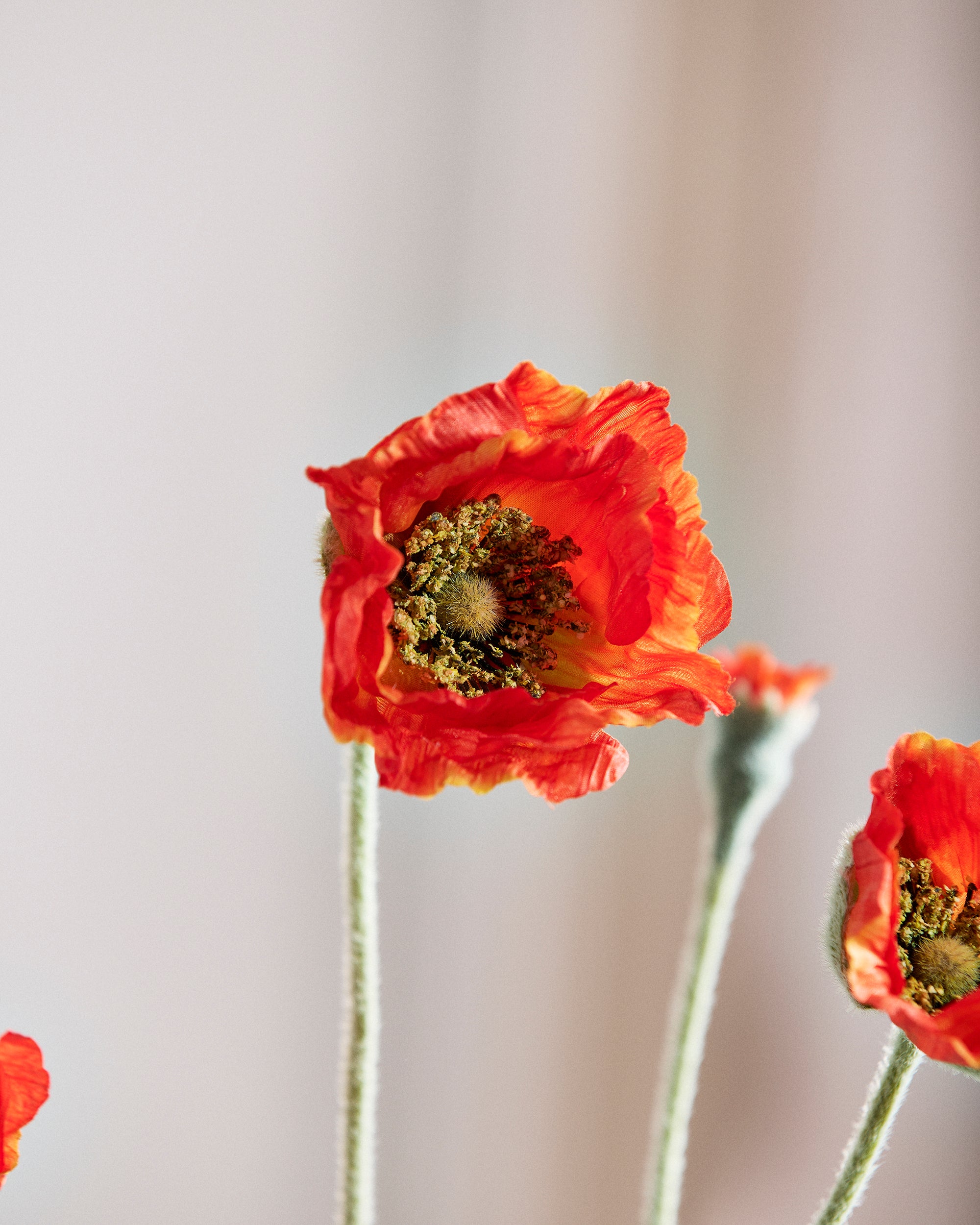 Karakterfuld valmue med store, krøllede kronblade, mørk midte og naturligt svaj i stilken. Den adskiller sig fra vores klassiske valmue ved at være større i blomsterhovedet og mere markant i udtrykket.