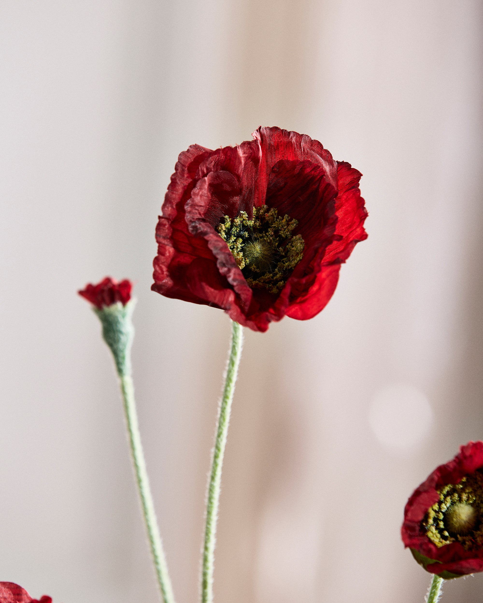 Karakterfuld valmue med store, krøllede kronblade, mørk midte og naturligt svaj i stilken. Den adskiller sig fra vores klassiske valmue ved at være større i blomsterhovedet og mere markant i udtrykket.