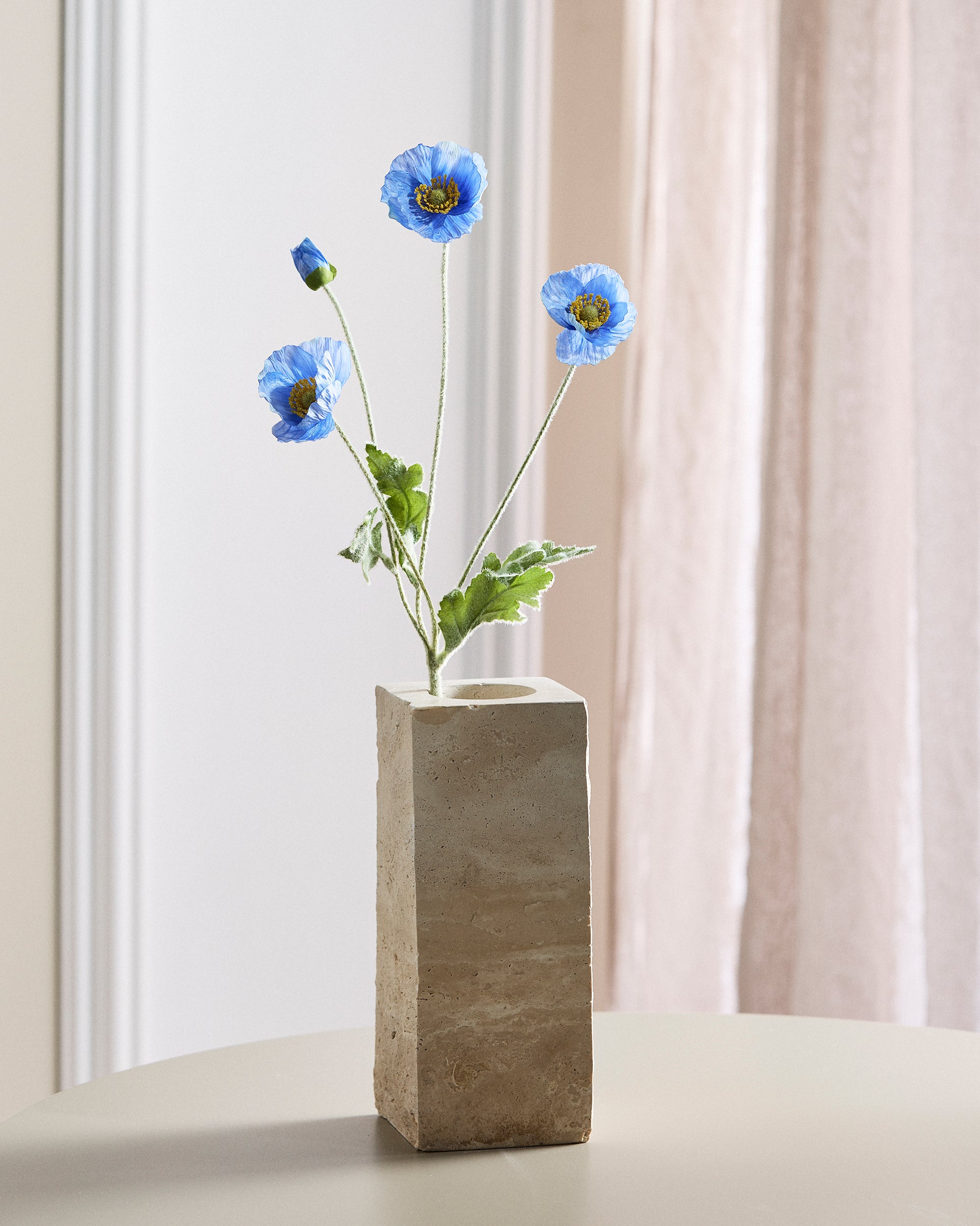 Stænglerne og bladene er omhyggeligt dækket med små hår, hvilket genskaber det naturlige udseende af en valmue og tilføjer en autentisk dimension til deres skønhed.