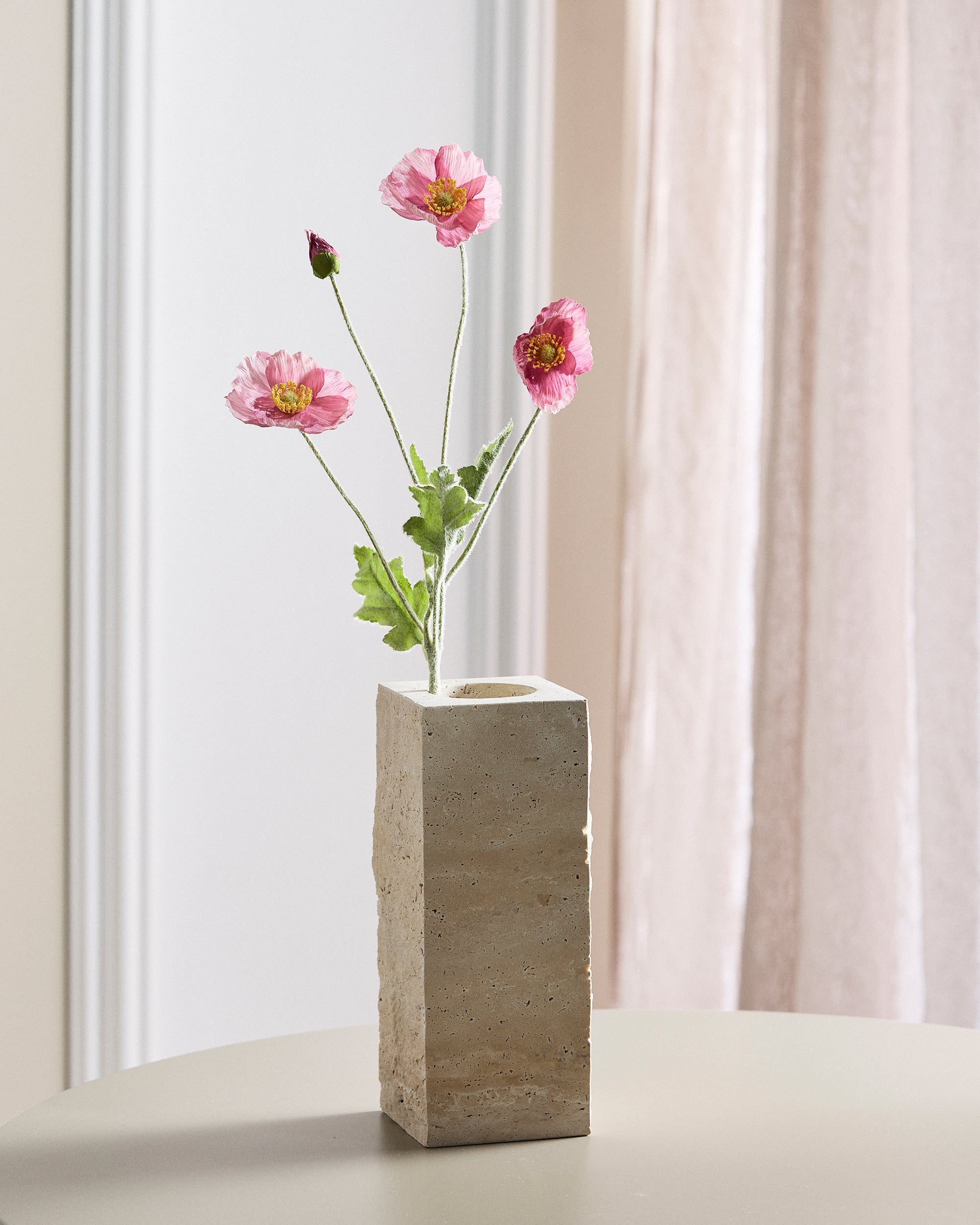 Stænglerne og bladene er omhyggeligt dækket med små hår, hvilket genskaber det naturlige udseende af en valmue og tilføjer en autentisk dimension til deres skønhed.