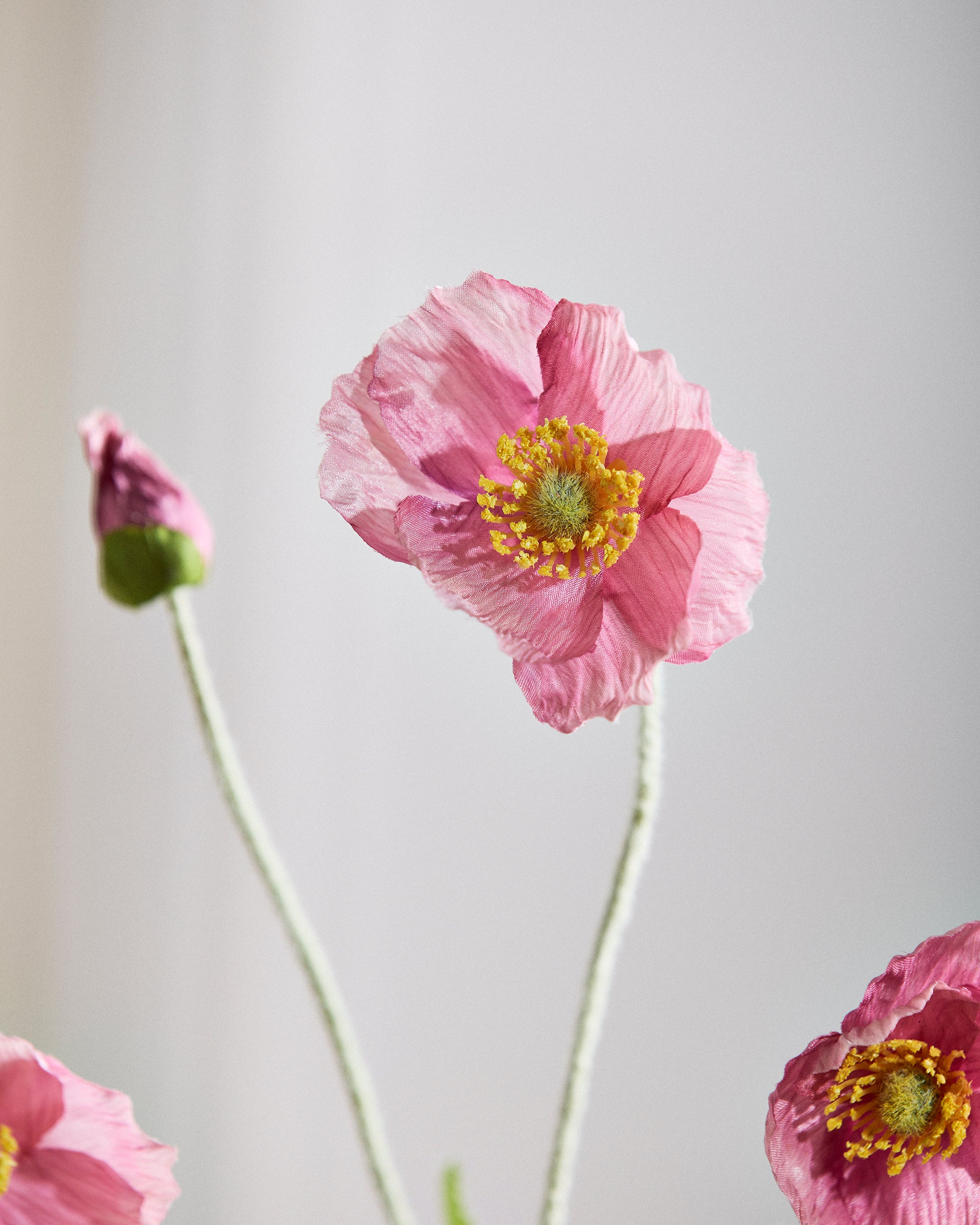 Valmuer repræsenterer med deres livlige og fængslende farvepalet en unik skønhed i blomsterverdenen. Disse sarte blomster står smukt alene i en buket, såvel som elegant indarbejdet i arrangementer