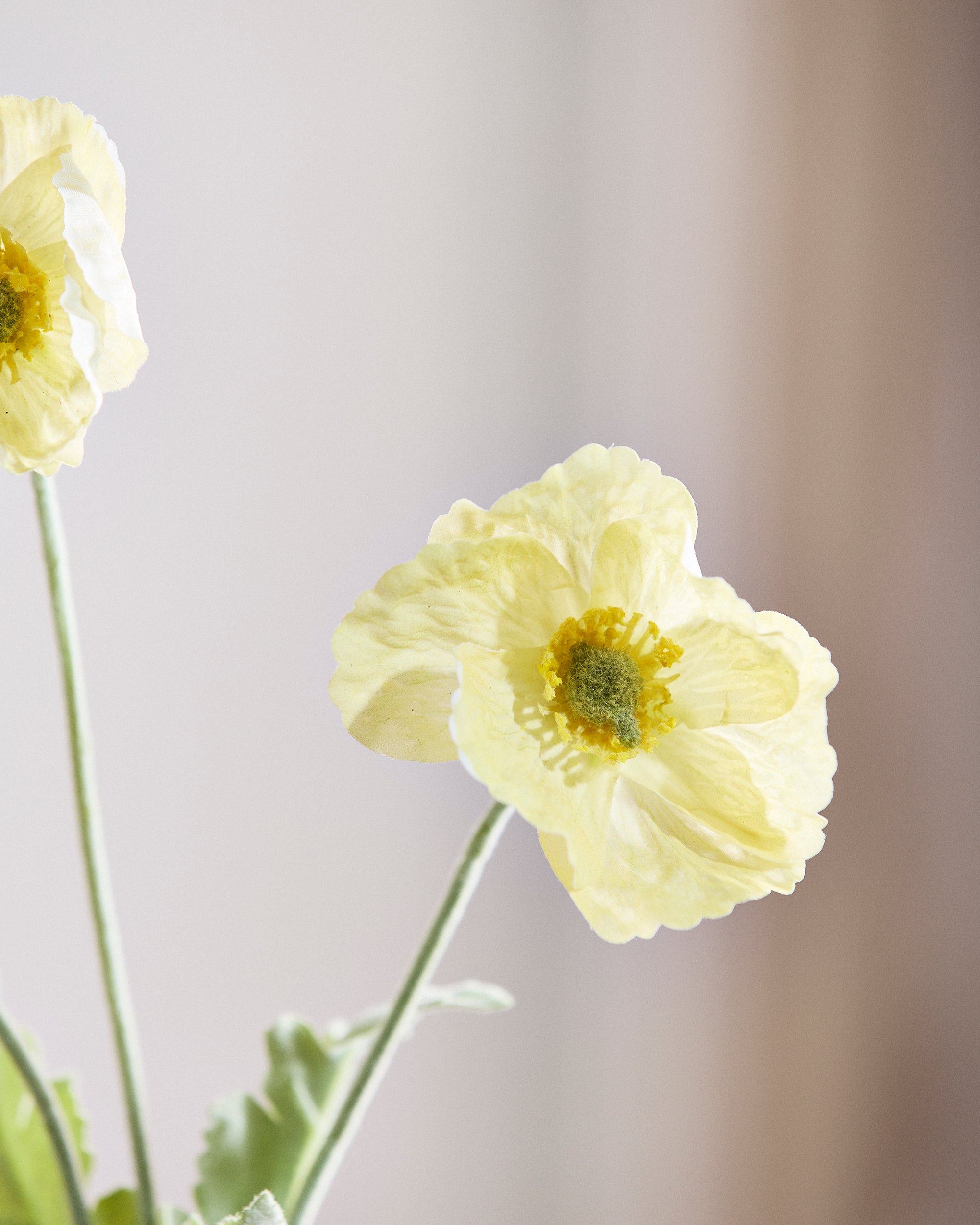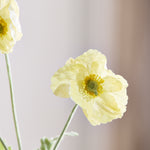 En smørgul valmue med silkeblade i et blødt, dæmpet udtryk – beklædt med latex for en naturtro, real touch-følelse. Bladene har en mat finish og føles let kølige mod huden, præcis som en friskplukket blomst. Perfekt som enkeltstående stilk eller i kombination med andre toner.