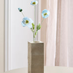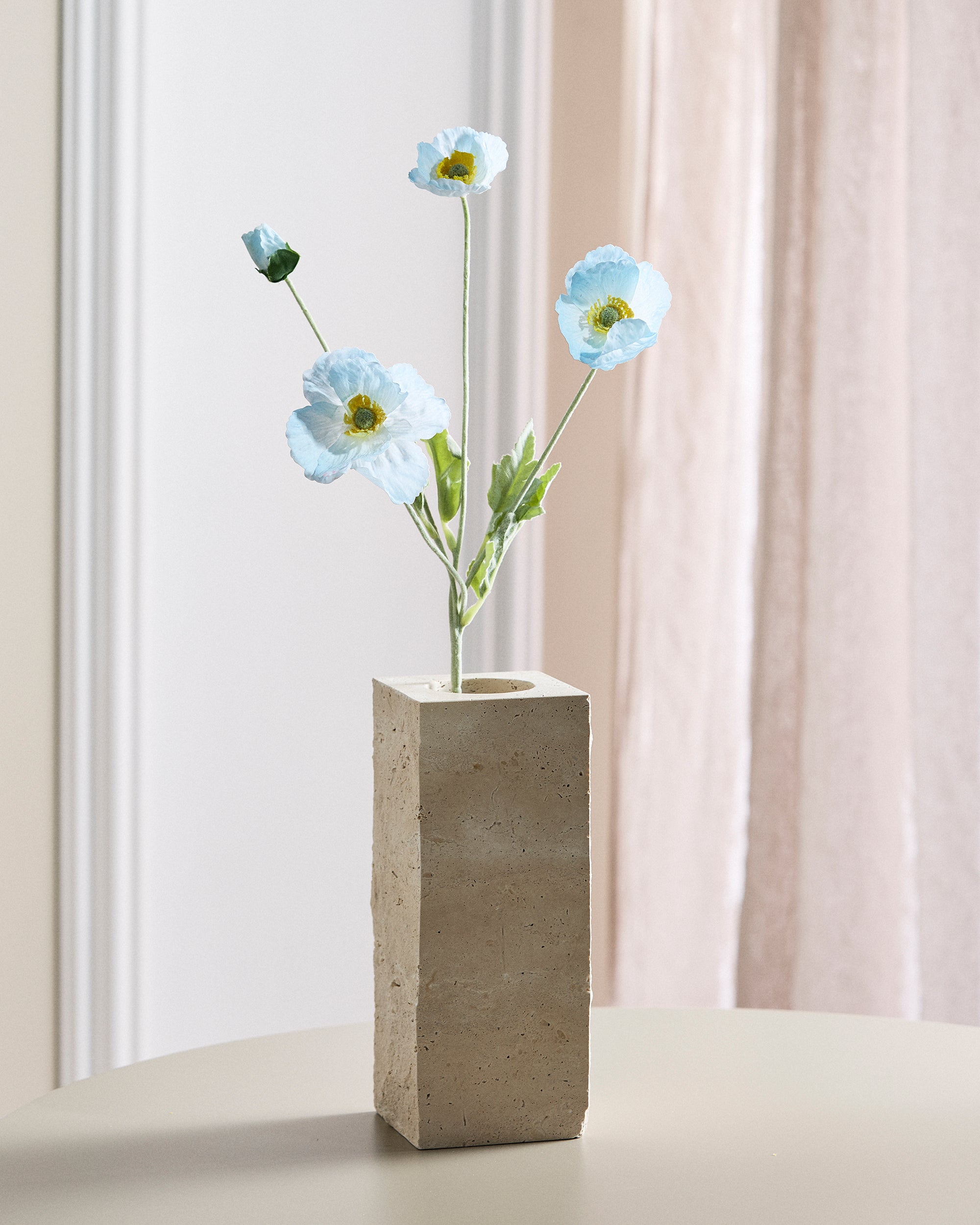 En lyseblå valmue med silkeblade i et blødt, dæmpet udtryk – beklædt med latex for en naturtro, real touch-følelse. Bladene har en mat finish og føles let kølige mod huden, præcis som en friskplukket blomst. Perfekt som enkeltstående stilk eller i kombination med andre toner.