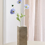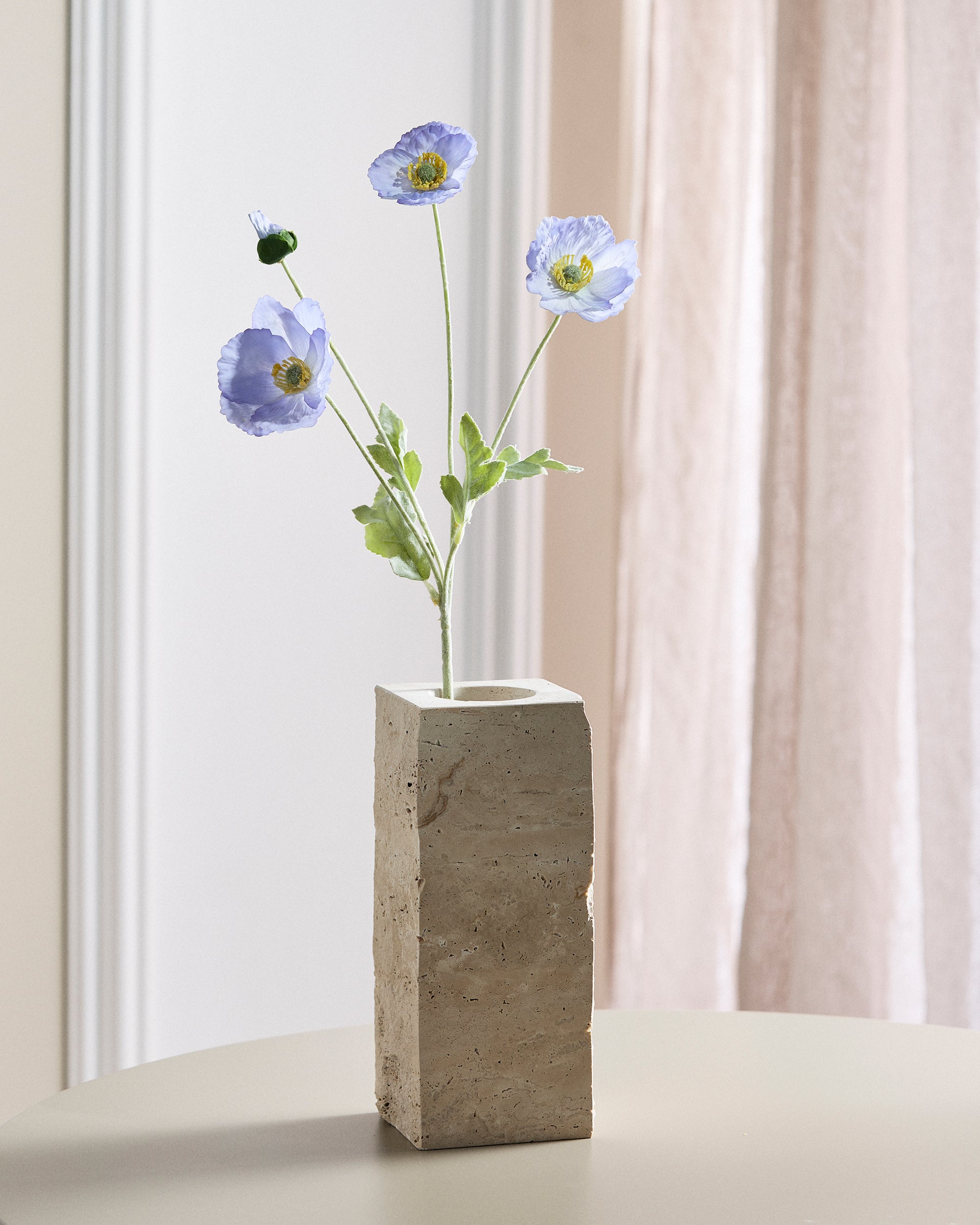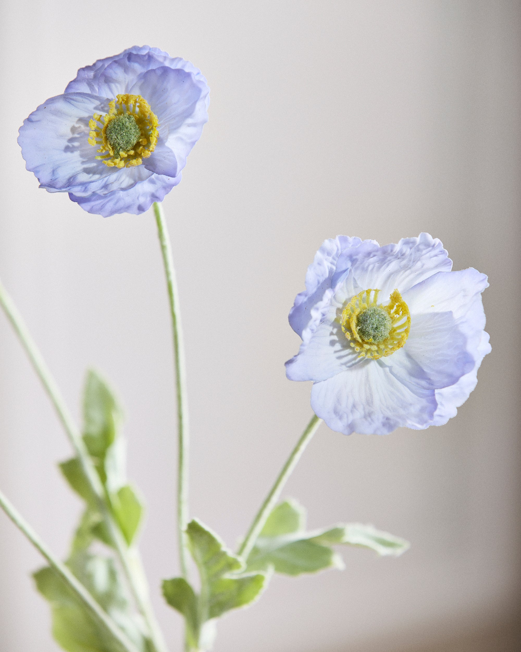 En Lila valmue med silkeblade i et blødt, dæmpet udtryk – beklædt med latex for en naturtro, real touch-følelse. Bladene har en mat finish og føles let kølige mod huden, præcis som en friskplukket blomst. Perfekt som enkeltstående stilk eller i kombination med andre toner.