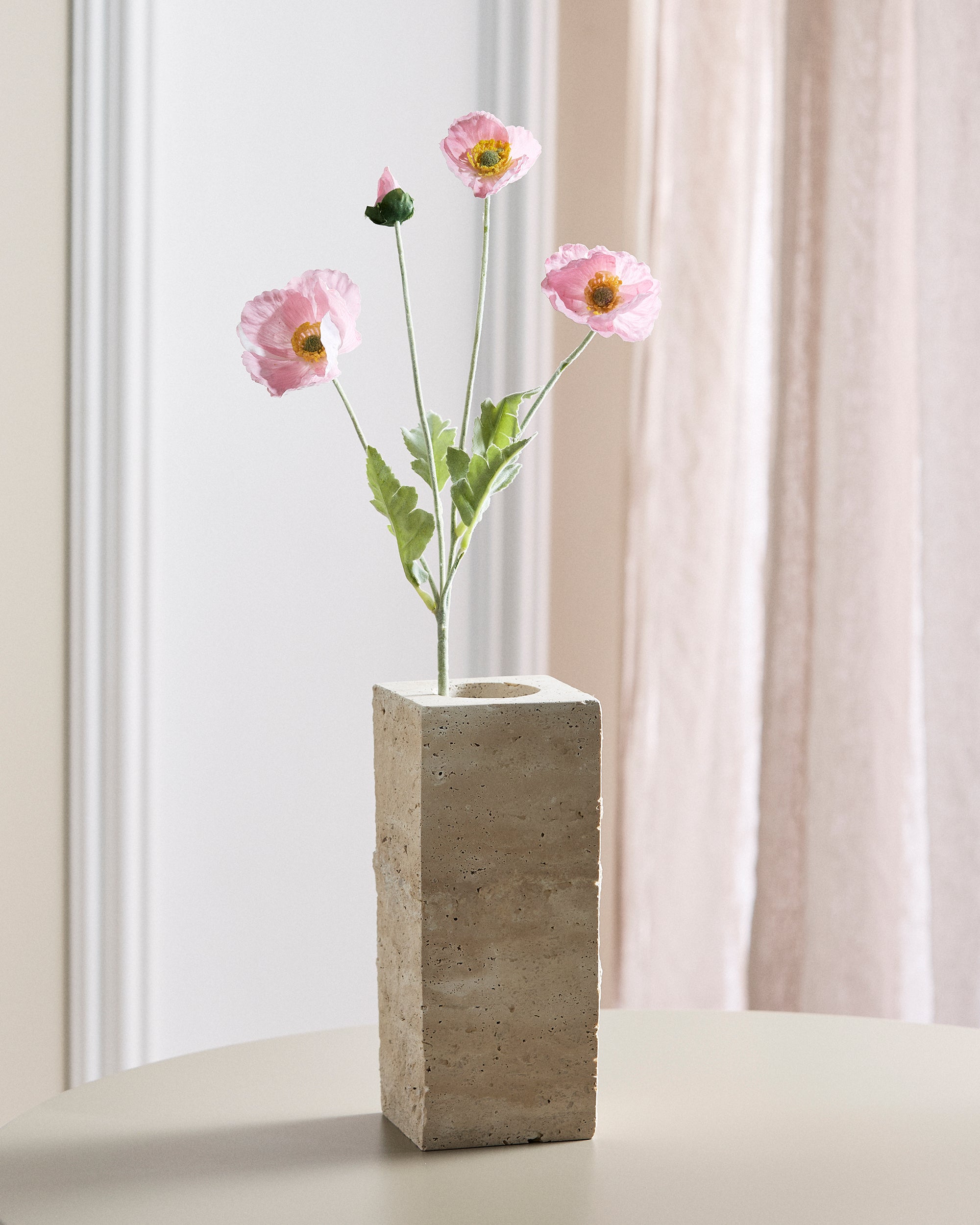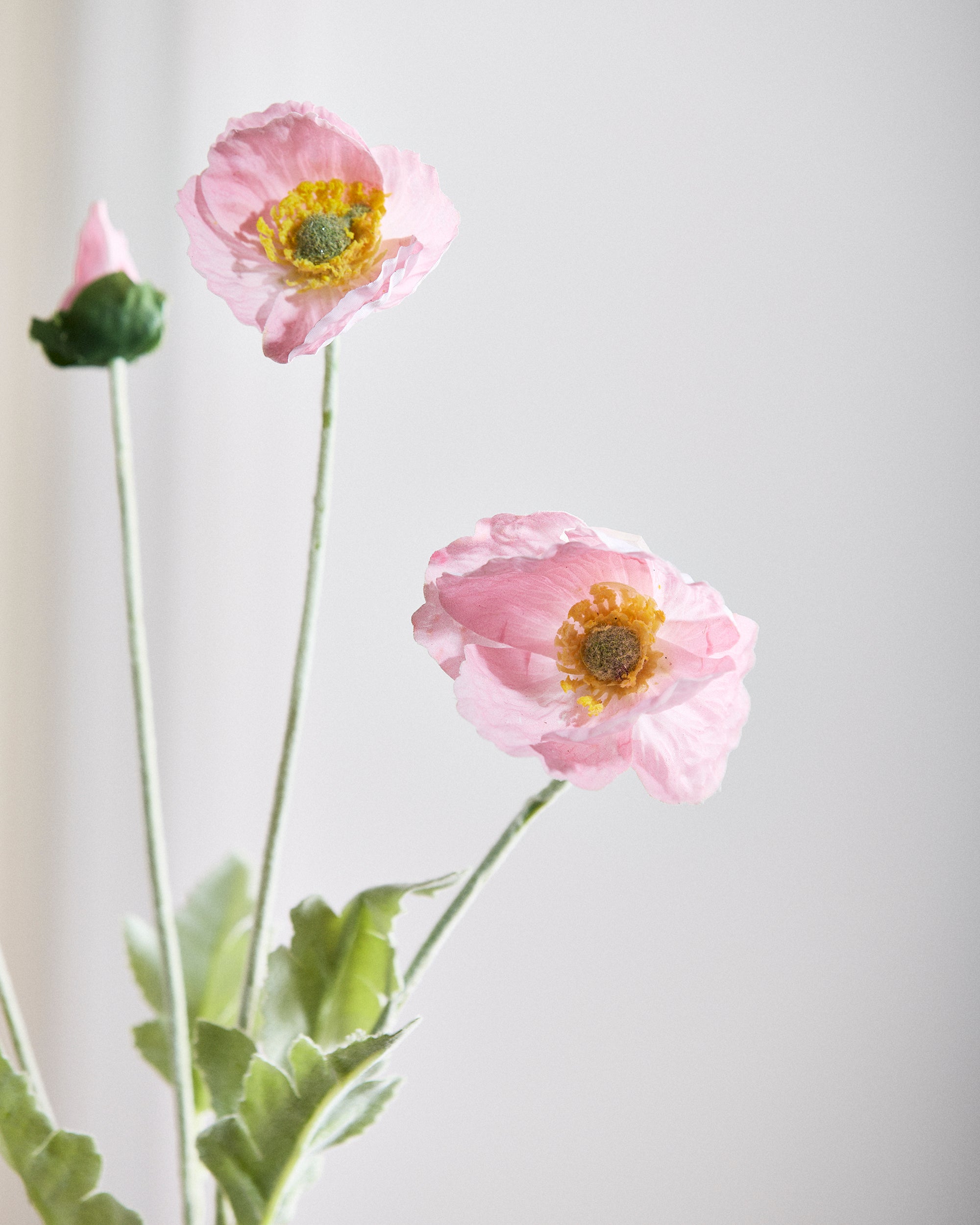En lyserød valmue med silkeblade i et blødt, dæmpet udtryk – beklædt med latex for en naturtro, real touch-følelse. Bladene har en mat finish og føles let kølige mod huden, præcis som en friskplukket blomst. Perfekt som enkeltstående stilk eller i kombination med andre toner.