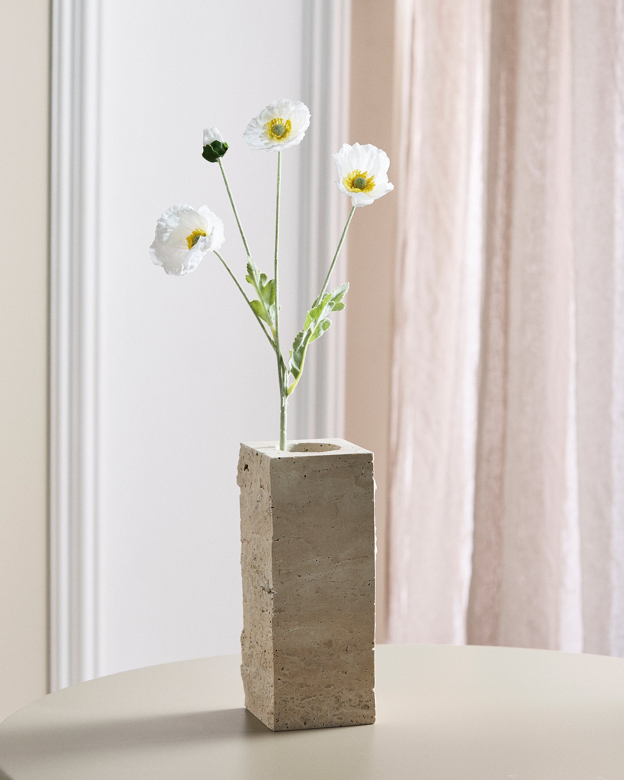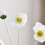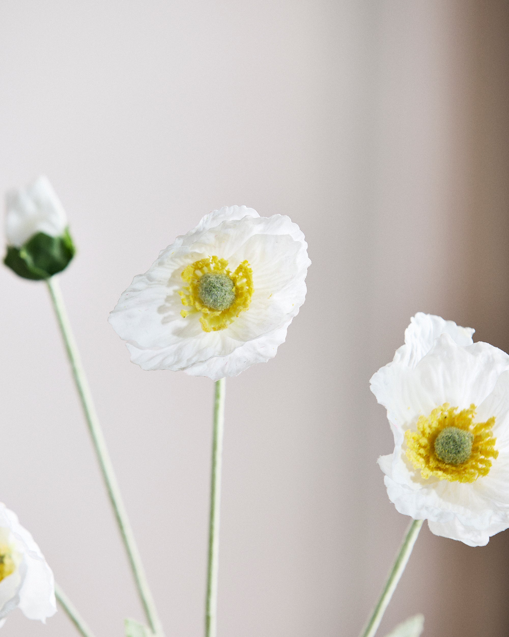 En hvid valmue med silkeblade i et blødt, dæmpet udtryk – beklædt med latex for en naturtro, real touch-følelse. Bladene har en mat finish og føles let kølige mod huden, præcis som en friskplukket blomst. Perfekt som enkeltstående stilk eller i kombination med andre toner.