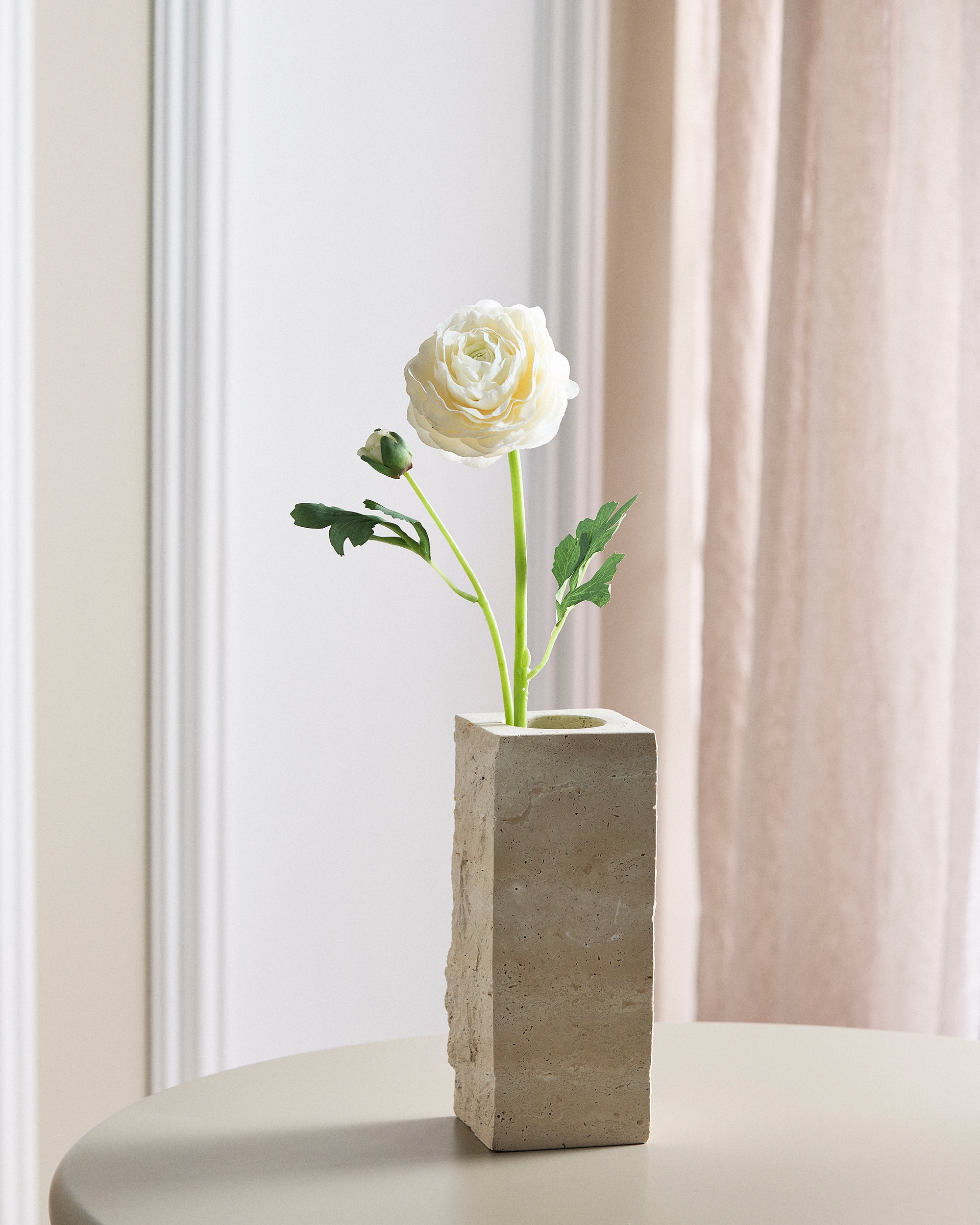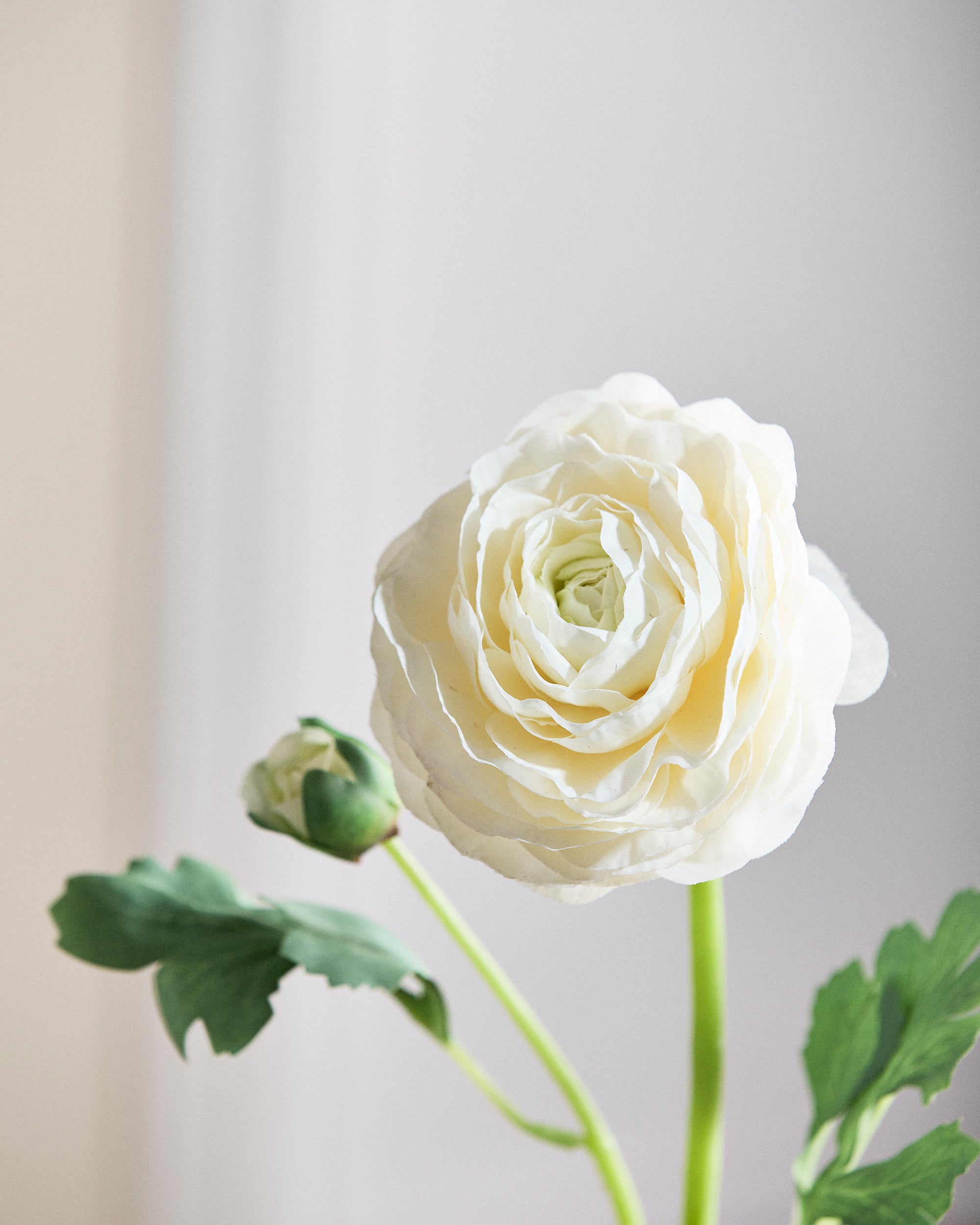 Vores Ranunkel Blomster er kendetegnet ved deres mange kronblade, hvilket skaber et rigt og fyldigt udseende. De sarte cremefarvede kronblade har også antydninger af pistaciegrøn, hvilket gør dem realistiske for øjet. Med deres legende stilke og voluminøse, papirtynde hvide kronblade bringer de et klassisk og romantisk element til din buket. Blomsten er lavet af papirtyndt stof, hvilket giver den et naturtro udseende.