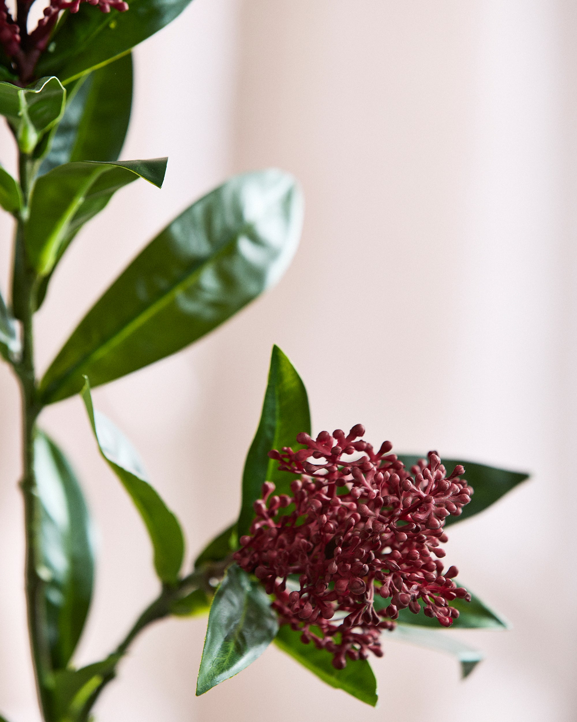 Bring naturens rå skønhed ind i hjemmet med vores Skimmia Bærgren. Hver gren er designet med omhu for at genskabe naturens fine detaljer, hvor de små, naturtro bær ligger smukt mellem det livagtige løv.