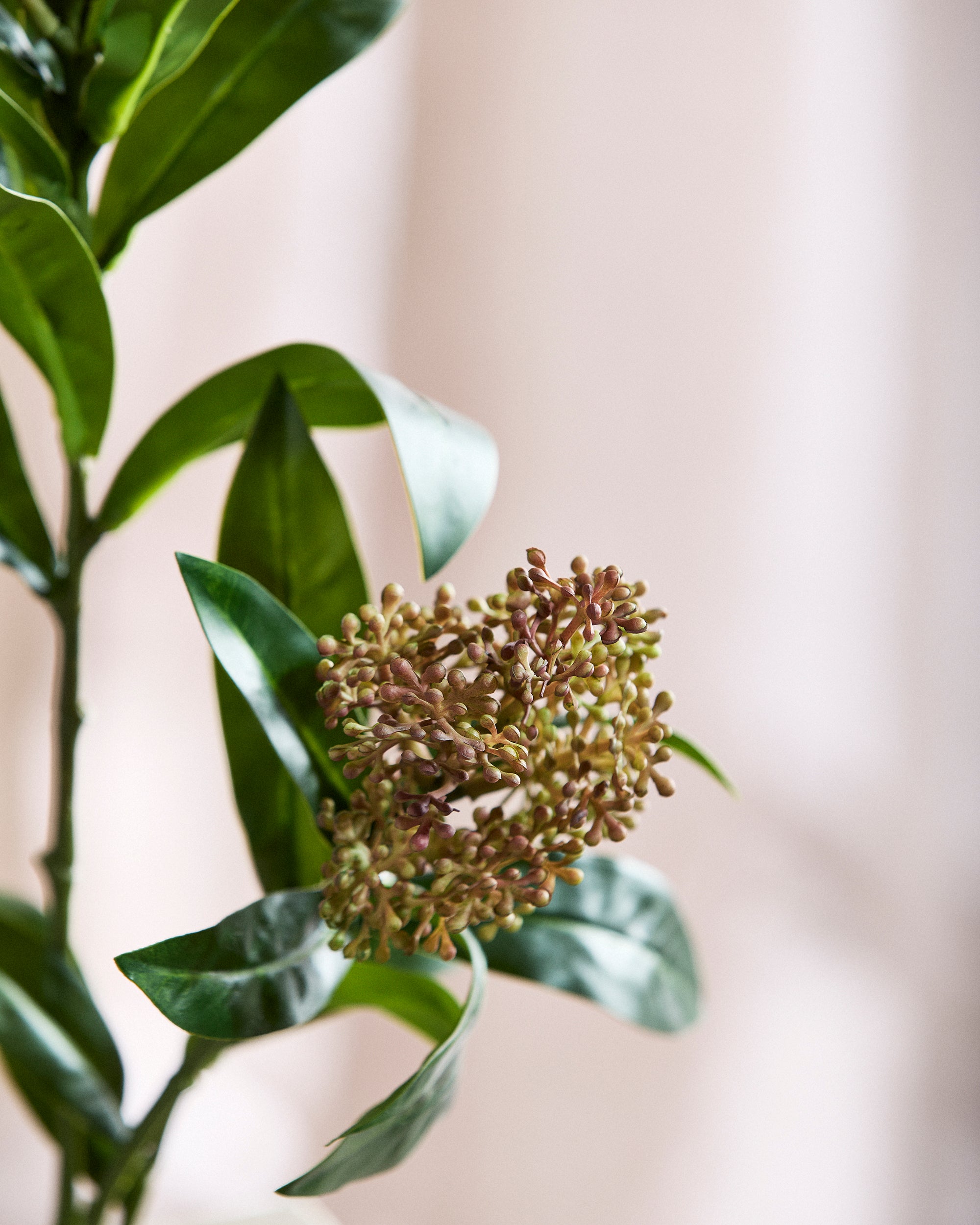 Bring naturens rå skønhed ind i hjemmet med vores Skimmia Bærgren. Hver gren er designet med omhu for at genskabe naturens fine detaljer, hvor de små, naturtro bær ligger smukt mellem det livagtige løv.