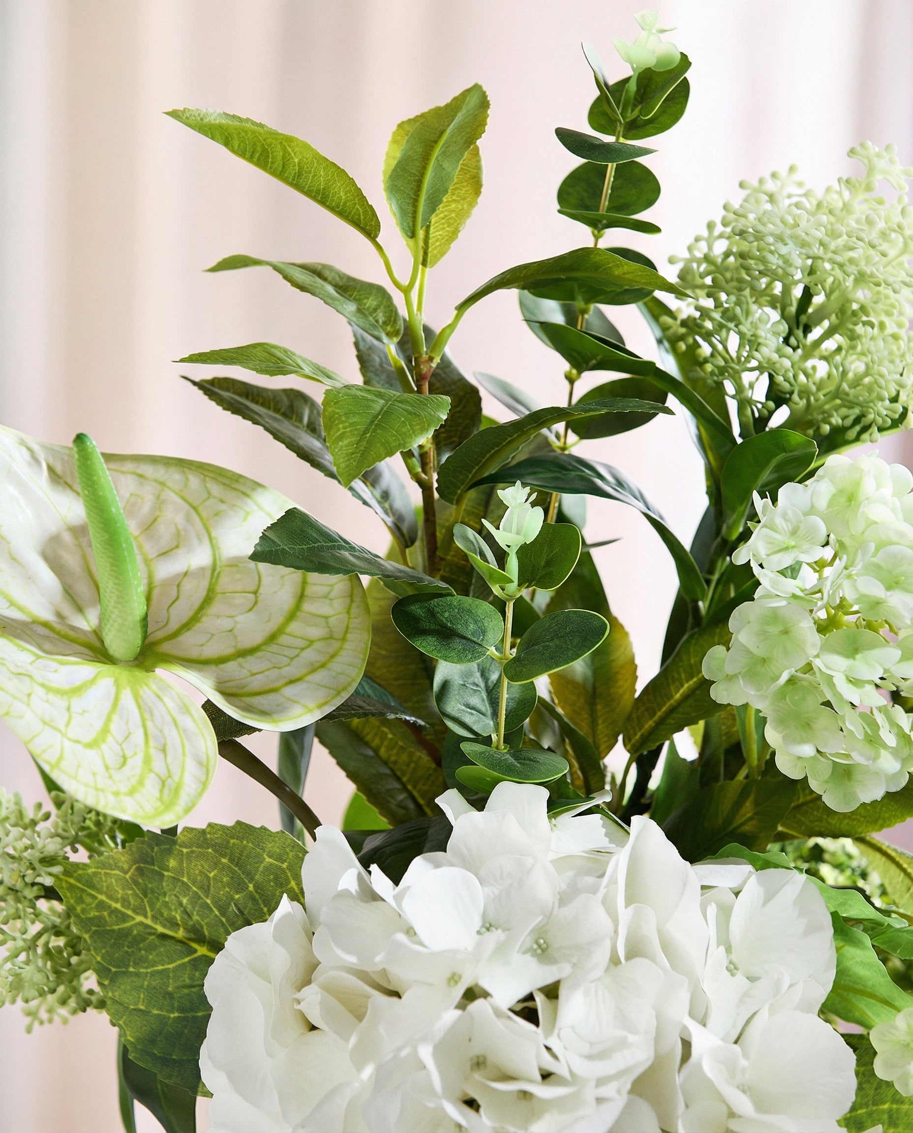 En moderne og elegant sammensætning i lysegrønne og cremehvide nuancer. Den fyldige hortensia, den lette anthurium og det nedfaldende amaranthus skaber et frodigt, men stadig roligt udtryk.