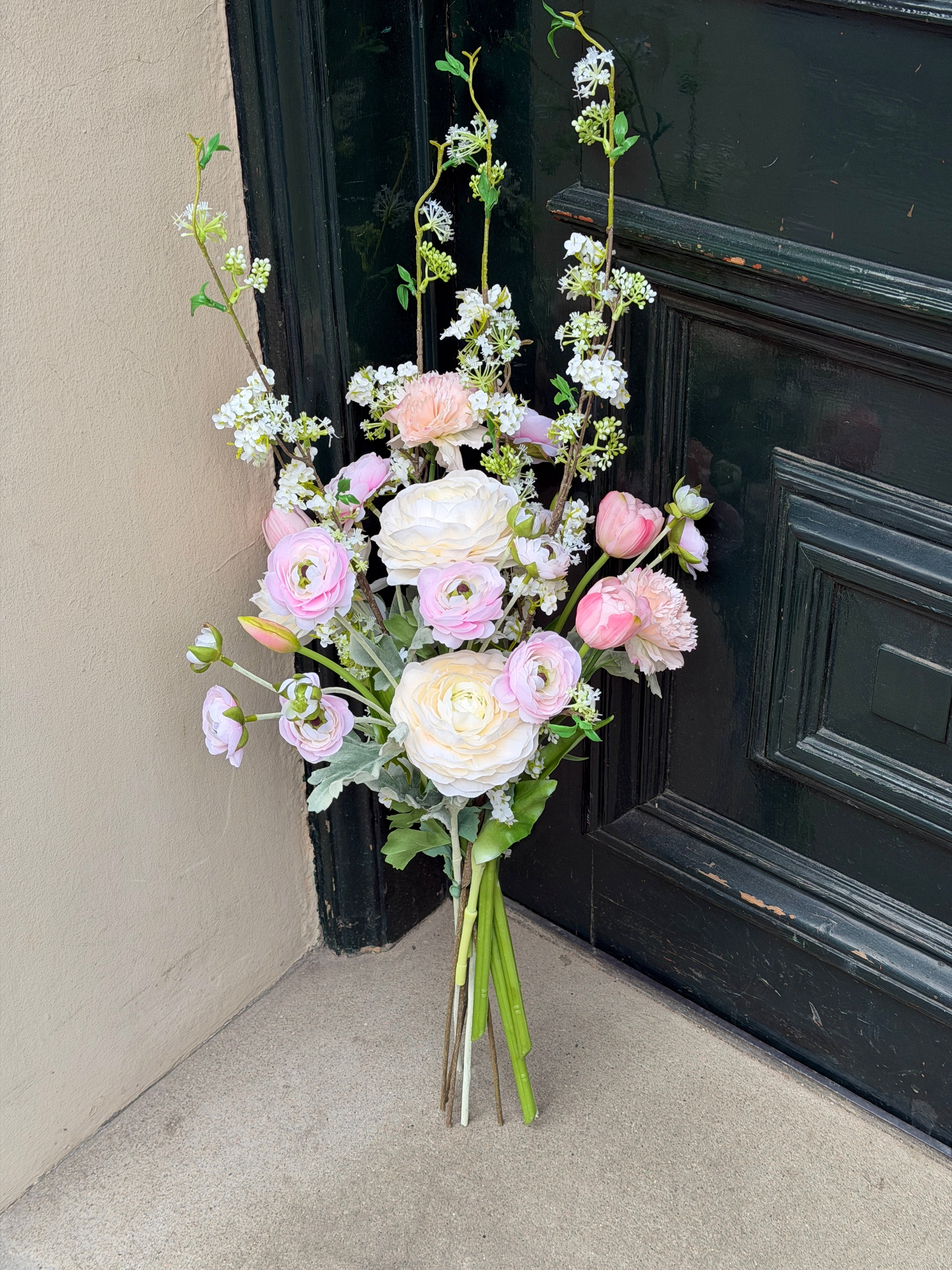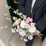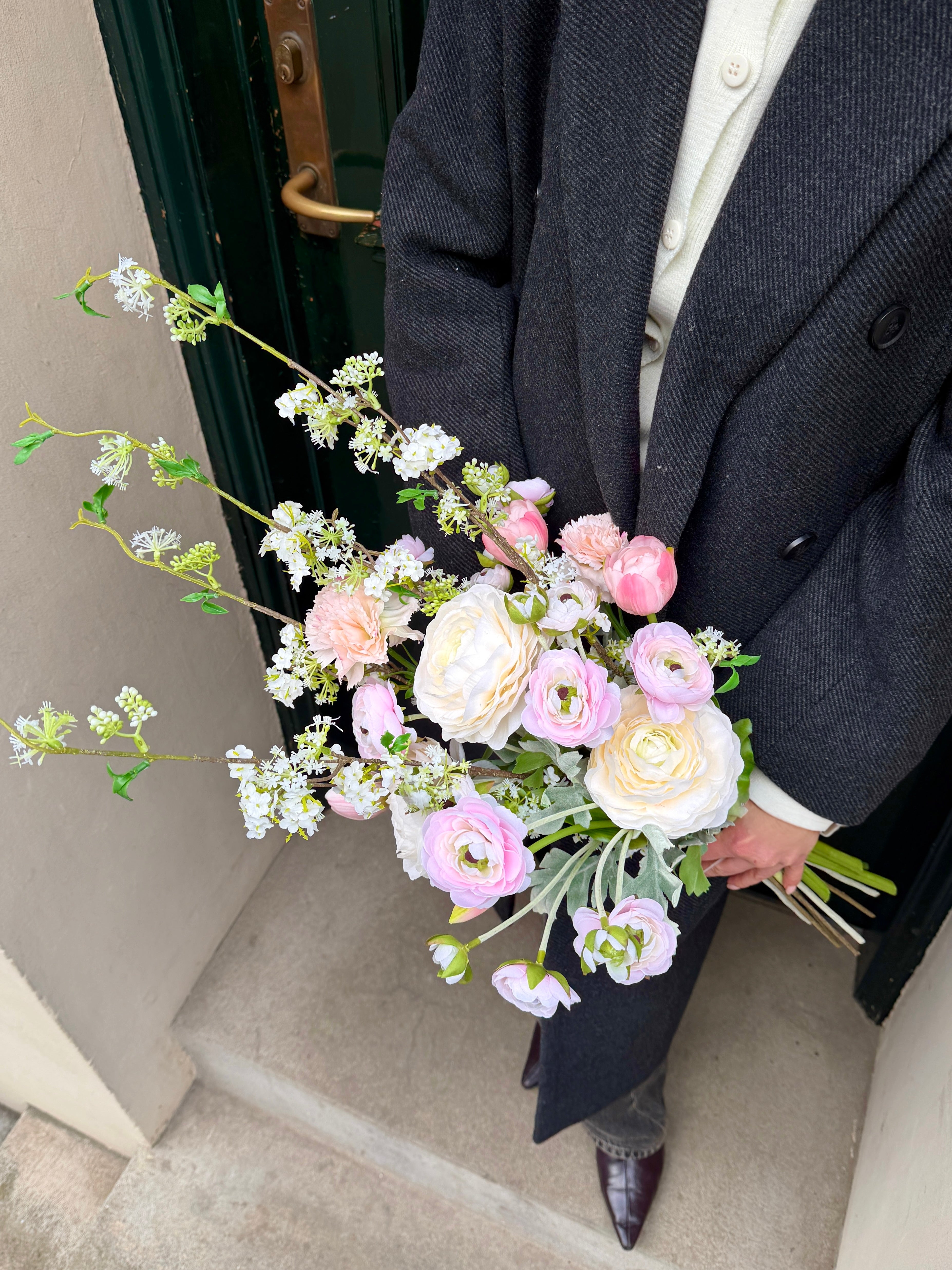 Vi anbefaler at lade snoren sidde på buketten, så blomsterne ikke ændrer position og forbliver, som den. er købt. Blomsterne kan selvfølgelig tilrettes som ønsket ved hjælp af en fleksibel stilk. Hvis du ønsker et løsere udtryk, kan du trække snoren længere ned ad stilkene.