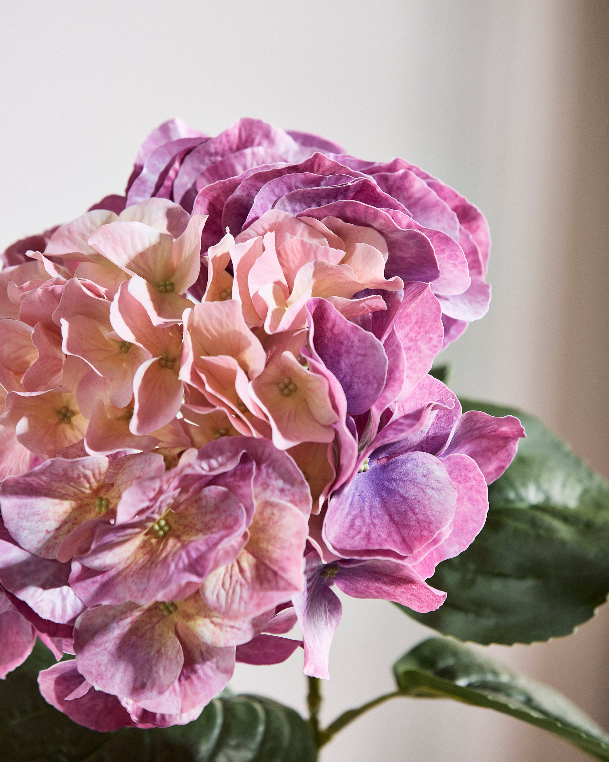 Mere naturtro end nogensinde er den kunstige Store Vintage Hortensia en omhyggeligt fremstillet blomst, der indfanger den tidløse skønhed fra ægte hortensiaer. Kronbladene er lavet af højkvalitets latex, som giver en realistisk tekstur og udseende.